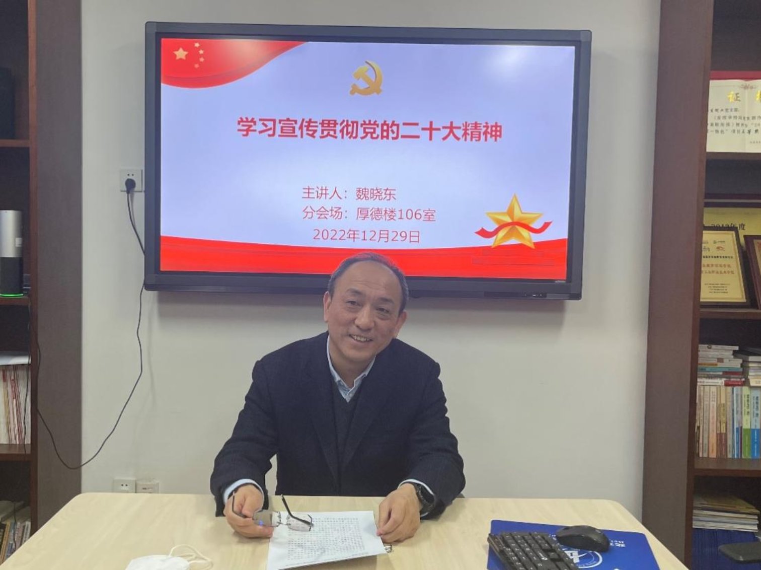 為持續深入學習宣傳貫徹黨的二十大精神,推動黨的二十大精神深入基層、深入一線、深入師生,12月29日上午,學校黨委副書記魏曉東采用“線上+線下”方式,為學工聯合黨總支、建筑工程與測繪學院黨總支和校工會的黨員干部開展黨的二十大精神專題宣講會,會議由學工聯合黨總支書記賀繼偉主持。