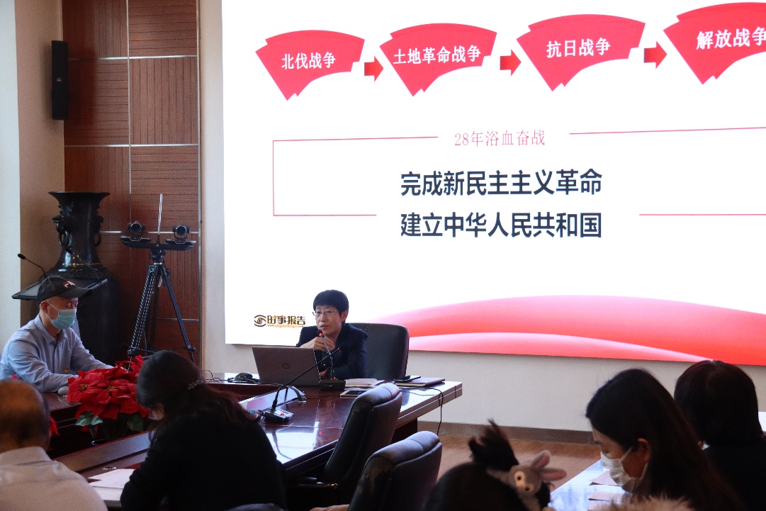 周燕副校長首先對十九屆六中全會精神作了深刻解讀,用“12233455101013”精煉地詮釋十九屆六中全會精神,包括“1”個《中共中央關于黨的百年奮斗重大成就和歷史經驗的決議》;“2”個確立,確立習近平同志黨中央的核心、全黨的核心地位、確立習近平新時代中國特色社會主義思想的指導地位;“2”個結合,堅持把馬克思主義基本原理同中國具體實際相結合、同中華優秀傳統文化相結合,創立了習近平新時代中國特色社會主義思想。這個思想是當代中國馬克思主義、二十一世紀馬克思主義,是中華文化和中國精神的時代精華,實現了馬克思主義中國化新的飛躍。馬克思主義中國化的“3”次歷史性飛躍,“3”個建設,新時代堅持和發展什么樣的中國特色社會主義、怎樣堅持和發展中國特色社會主義;建設什么樣的社會主義現代化強國、怎樣建設社會主義現代化強國;建設什么樣的長期執政的馬克思主義政黨、怎樣建設長期執政黨;“4”個偉大成就,中國共產黨從開天辟地,到改天換地,再到翻天覆地,到現在的驚天動地,帶領中國人民從一個勝利走向另一個勝利。“5”大歷史意義,“5”個必須,“10”個明確,“10”個堅持和“13”個領域的歷史成就。周燕副校長通過數字深入淺出地解讀了六中全會的會議精神,并重點就“兩個確立”的重要論斷實踐依據、理論依據進行了解讀,對黨的百年的四個歷史時期取得的偉大成就特別是進入新時代,以習近平同志為核心的黨中央團結帶領中國人民自信自強,守正創新,黨和國家事業取得歷史性成就,發生歷史性變革進行了詳細介紹。