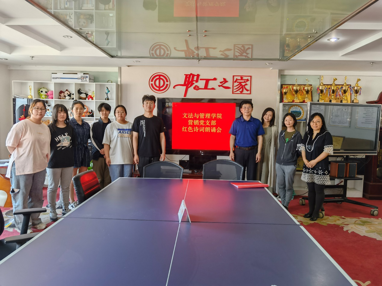 5月21日下午,營銷黨支部在匠心樓十層職工之家舉行主題黨日活動--紅色詩詞朗誦會。文法與管理學院黨總支書記楊嶺、營銷支部教師黨員與部分學生黨員、預備黨員、入黨積極分子共同參與了這次活動?;顒佑蔂I銷支部書記李松主持。