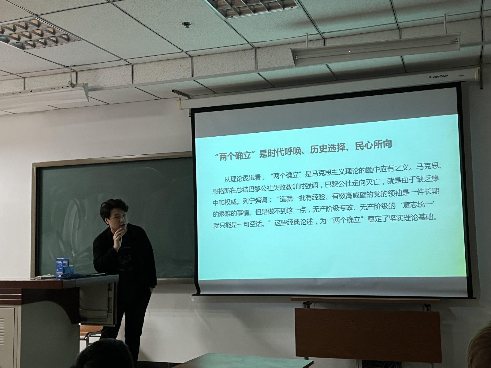 李鵬飛老師講到,在中國(guó)共產(chǎn)黨百年華誕的重要時(shí)刻,在“兩個(gè)一百年”奮斗目標(biāo)歷史交匯關(guān)鍵節(jié)點(diǎn)上,黨的十九屆六中全會(huì)勝利召開(kāi),審議通過(guò)了《中共中央關(guān)于黨的百年奮斗重大成就和歷史經(jīng)驗(yàn)的決議》,審議通過(guò)了《關(guān)于召開(kāi)黨的第二十次全國(guó)代表大會(huì)的決議》。全會(huì)全面總結(jié)黨的百年奮斗重大成就和歷史經(jīng)驗(yàn),深刻揭示了“過(guò)去我們?yōu)槭裁茨軌虺晒Α⑽磥?lái)我們?cè)鯓硬拍芾^續(xù)成功”,對(duì)于推動(dòng)全黨進(jìn)一步統(tǒng)一思想、統(tǒng)一意志、統(tǒng)一行動(dòng),更加堅(jiān)定自覺(jué)地踐行初心使命,在新時(shí)代更好堅(jiān)持和發(fā)展中國(guó)特色社會(huì)主義,具有重大現(xiàn)實(shí)意義和深遠(yuǎn)歷史意義。李鵬飛老師談到,會(huì)議高度概括了“十個(gè)堅(jiān)持”寶貴經(jīng)驗(yàn),具有重大的政治意義、歷史意義和時(shí)代意義。希望各位同學(xué)深入學(xué)習(xí)貫徹十九屆六中全會(huì)精神,在學(xué)習(xí)中汲取智慧力量,努力把學(xué)習(xí)成果轉(zhuǎn)化為成長(zhǎng)成才的強(qiáng)大動(dòng)力。