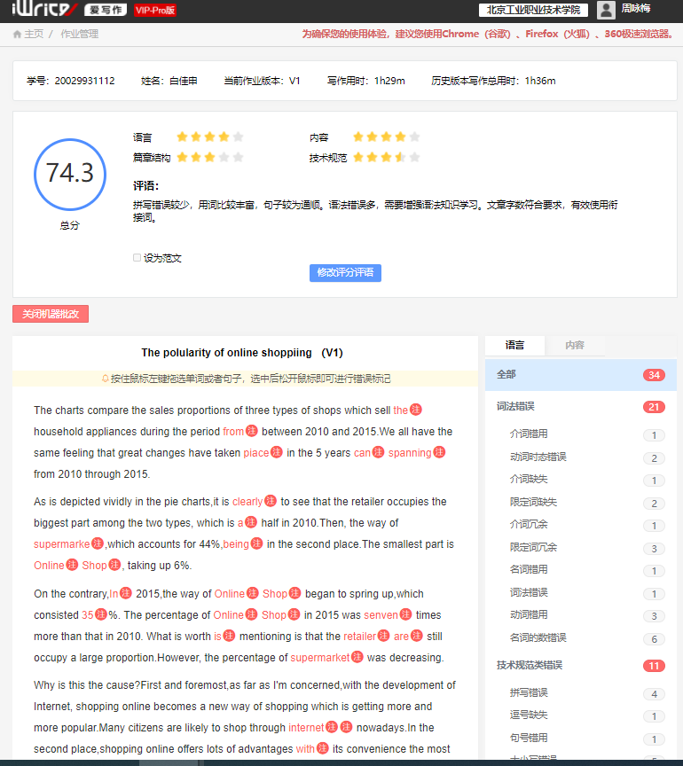 “中國教育電視臺·外研社杯”職場英語挑戰賽寫作大賽(高職組)是由教育部職業院校外語類專業教學指導委員會指導、外語教學與研究出版社主辦的面向高職高專學生的全國性公益賽事。大賽本著“以賽促教”、“以賽促學”、“以賽育人”的理念,助力高等職業院校人才培養模式創新和外語教育教學改革。學生用文字闡述觀點、用語言表達思想,所取得的驕人的成績,也凝結著指導教師,以及指導教師所在的公共英語教研室所有英語教師團隊的不懈的努力和辛勤的汗水。一年來,公共英語教研室在學院領導的帶領下,多次進行線上線下教研活動,研討寫作教學的新模式,充分利用各種信息化手段,提高寫作教學效率。我院孫川副院長帶領英語教研室教師跟外研社合作的課題:基于iWrite智能評閱平臺的英語寫作教學策略研究,以高職學生為樣本,追蹤其在使用iWrite平臺過程中英文寫作各個維度的成績變化,結合成績分析,爭取達到運用現代信息技術輔助傳統英語寫作教學,優化教學質量的效果。寫作大賽的選手們充分利用了這一教學資源,在iwrite 寫作平臺進行線上寫作,從開始的滿篇紅色錯誤提示到最后的零錯誤,學生的作文成績一次比一次高,信心也一次比一次足。