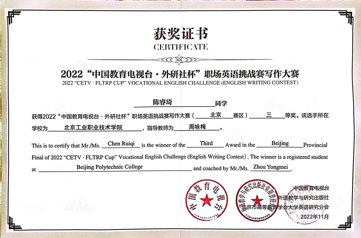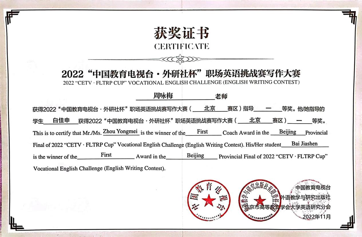 由中國職業技術教育學會、中國教育報刊社共同指導,中國教育電視臺、外語教學與研究出版社聯合主辦的“中國教育電視臺·外研社杯”職場英語挑戰賽寫作大賽(高職組)北京賽區成績出爐。來自全市30余所高職院校的50多名學子以筆為鋒,競技文思,在挑戰賽的舞臺上精研寫作技能,淬煉語言藝術,展青春風采,綻時代芳華。我校大數據與會計2032班的李澤文同學、網絡2232班的白佳申同學、信息安全2131班的陳睿琦同學代表我校參加了此次大賽,李澤文、白佳申獲得一等獎,陳睿琦獲得三等獎,指導教師周詠梅老師獲得優秀指導教師獎。