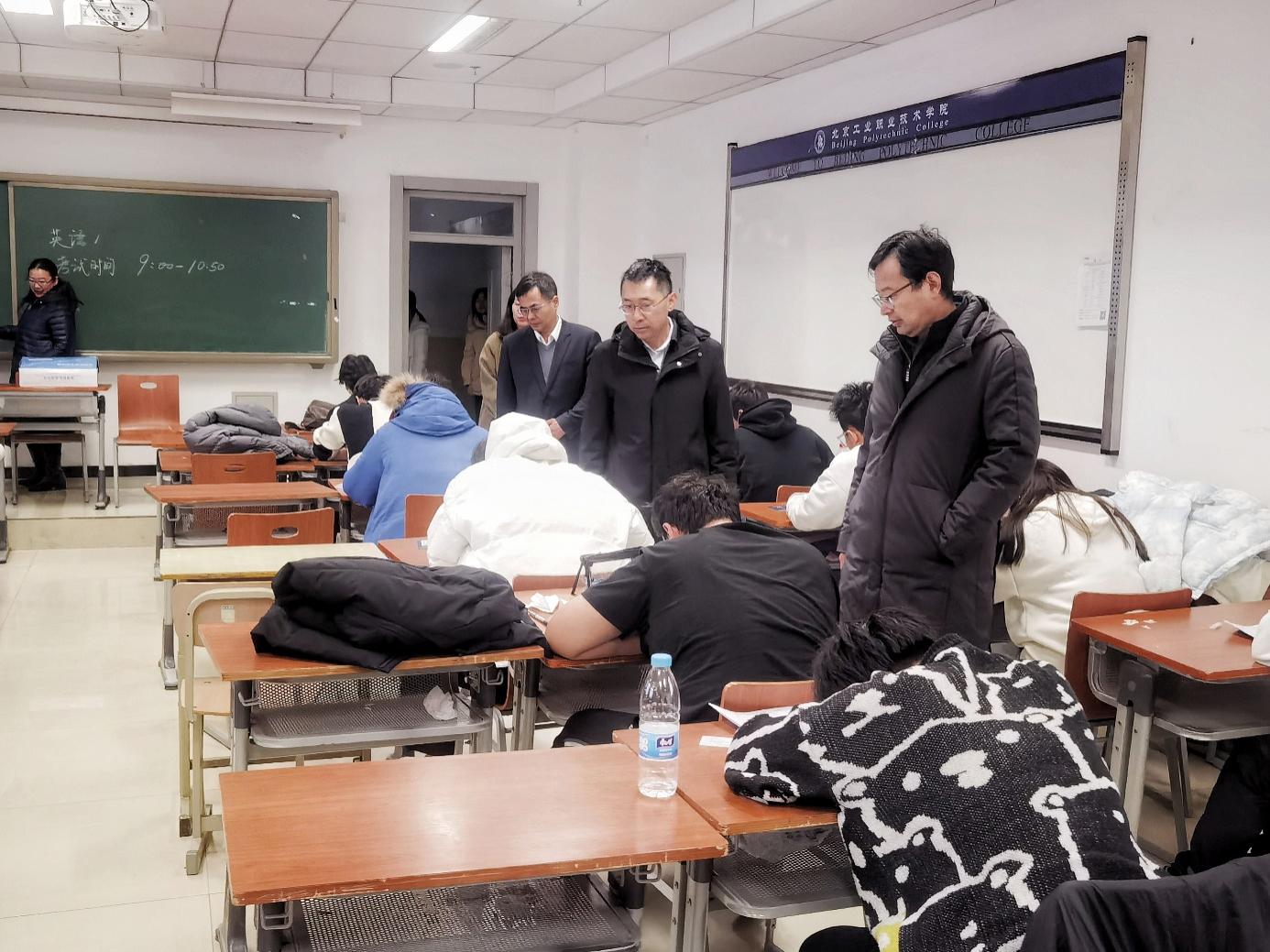 我校2023-2024學(xué)年第一學(xué)期期末考試于2024年1月13日、14日進行,學(xué)校黨委副書記、院長柳長安,黨委常委、副院長史運濤到考場現(xiàn)場巡視,強調(diào)要高度重視考場紀律,所有監(jiān)考教師必須嚴格按照要求規(guī)范工作,并就發(fā)現(xiàn)的不足之處進行了指導(dǎo)。