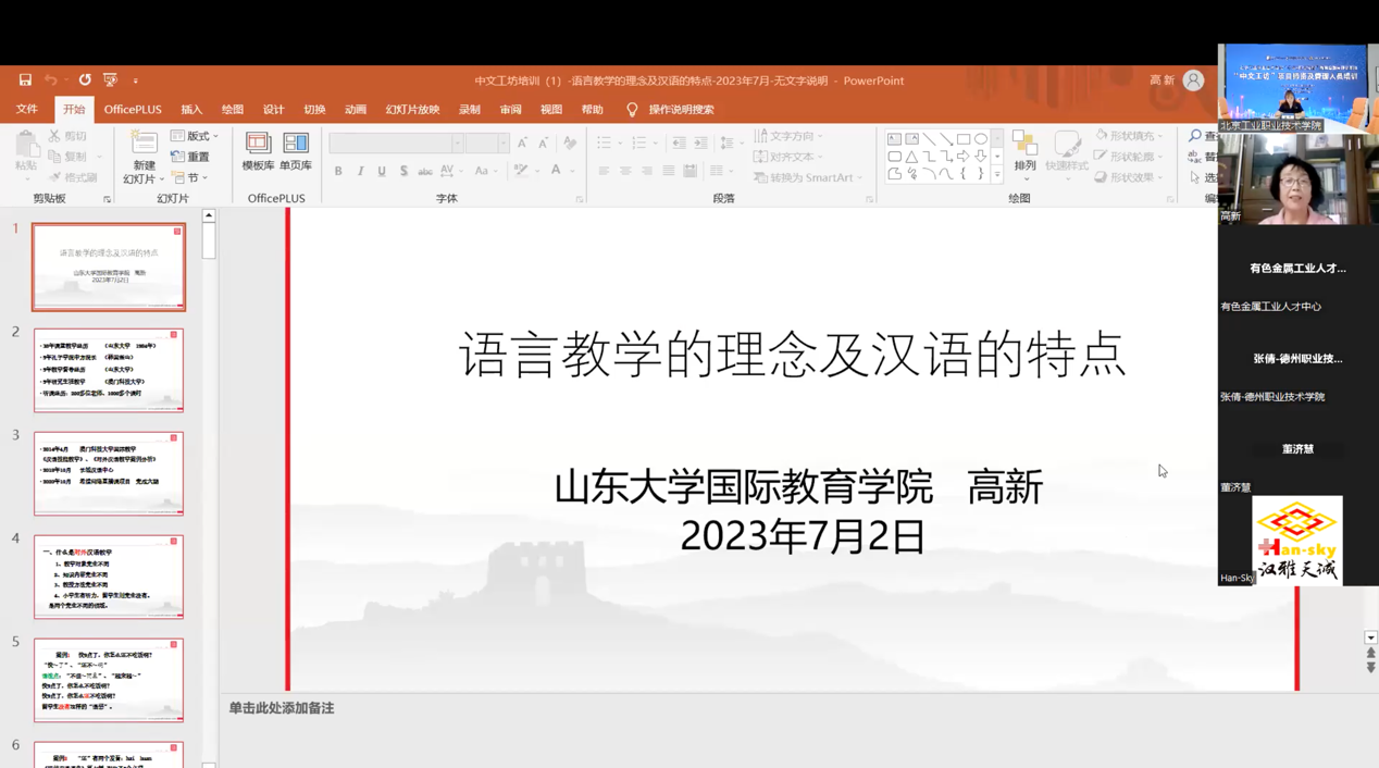 華東師范大學(xué)國際漢語文化學(xué)院的陸驍紅副教授則帶來的是主題為新時代國際中文教師能力素養(yǎng)與職業(yè)發(fā)展,課程圍繞新時代國際中文教師能力素養(yǎng)和職業(yè)發(fā)展。著重提升職業(yè)院校參與國際中文教師的課堂教學(xué)能力,教學(xué)反思能力,溝通合作能力和教育研究能力的提升。