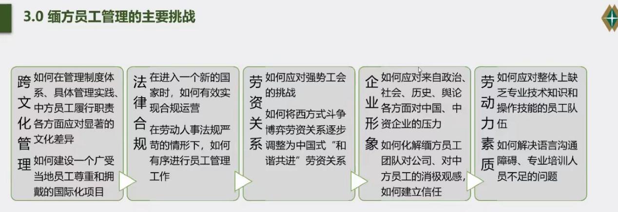 隸屬中國兵器工業(yè)集團(tuán)公司的萬寶礦業(yè)有限公司人力資源部副主任喬迅迤受邀為本次培訓(xùn)授課,內(nèi)容涉及跨文化管理,勞資關(guān)系,企業(yè)管理等方面。服務(wù)中資企業(yè)培養(yǎng)海外本土人才培養(yǎng)和幫助從事企業(yè)服務(wù)管理工作的人員提高綜合業(yè)務(wù)能力,實現(xiàn)本土化人才培養(yǎng)和“走出去”企業(yè)管理需求的精準(zhǔn)對接。
