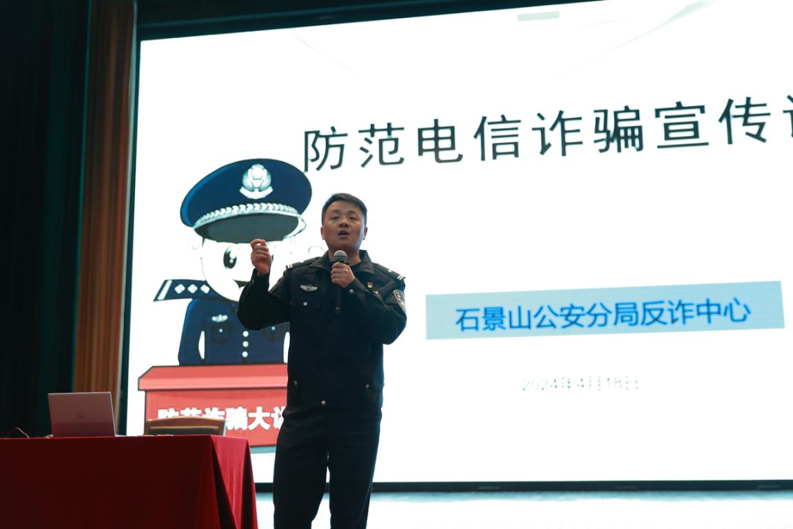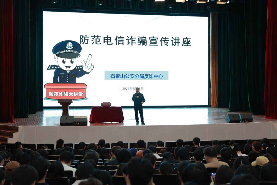 講座特別邀請石景山區公安分局刑偵支隊現案中隊邢運偉隊長進行授課。邢隊長用生動的案例,深入講解了電信詐騙的趨勢、種類和防范三個方面的知識,引導學生下載、安裝、注冊并使用國家反詐中心推出的全民反詐App,提醒同學們收到涉及錢財的可疑信息時要提高警惕,告誡學生電信網絡詐騙手段花樣百出防不勝防,千萬不要貪圖便宜匯款轉賬上當受騙,做到“不信、不聽、不轉賬”,不輕易向對方透露個人信息、驗證碼等隱私。過程中,邢隊長頻頻與學生進行互動,氣氛熱烈活躍,課后還與學生就常見騙術進行答疑解惑。