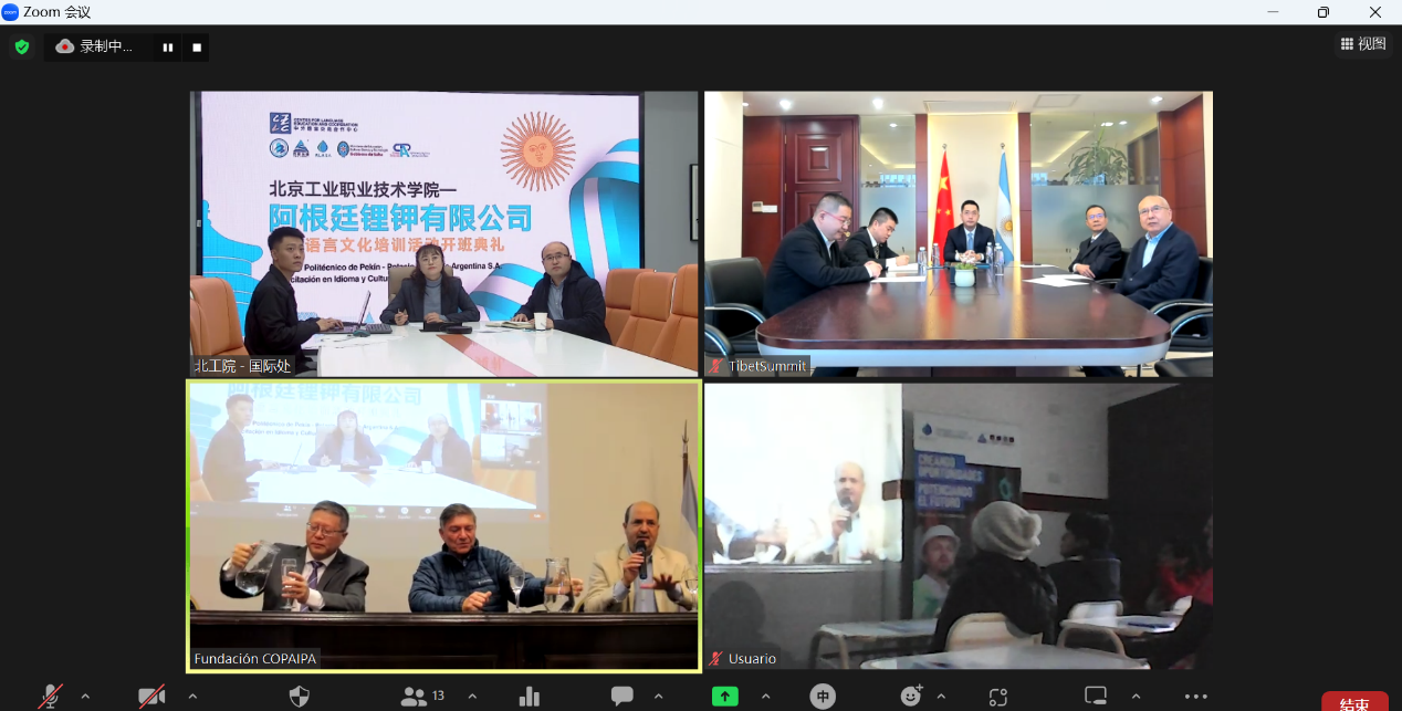 北京時間11月2日早上,阿根廷當?shù)貢r間11月1日晚上,北京工業(yè)職業(yè)技術(shù)學(xué)院—阿根廷鋰鉀有限公司中國語言文化培訓(xùn)活動開班典禮于線上順利舉行。中國教育部中外語言交流合作中心黨委副書記于天琪,北京市教育委員會副主任孫其軍,中國駐阿根廷使館商務(wù)參贊夏娣婭,阿根廷薩爾塔省經(jīng)濟和公共服務(wù)部部長羅伯特?迪布?阿舒爾,北京工業(yè)職業(yè)技術(shù)學(xué)院黨委副書記、院長安江英,薩爾塔省工程師協(xié)會基金會(COPAIPA)主席費利佩?比埃拉、薩爾塔省教育秘書迭戈·洛佩茲·莫里約,阿根廷鋰鉀有限公司董事長茅元愷,阿根廷鋰鉀有限公司副總經(jīng)理季新生等領(lǐng)導(dǎo)共同出席了開班典禮。參加此次開班典禮的還有來自阿根廷鋰鉀有限公司90余名企業(yè)學(xué)員。開班典禮由北京工業(yè)職業(yè)技術(shù)學(xué)院國際交流合作處副處長孟晴主持。