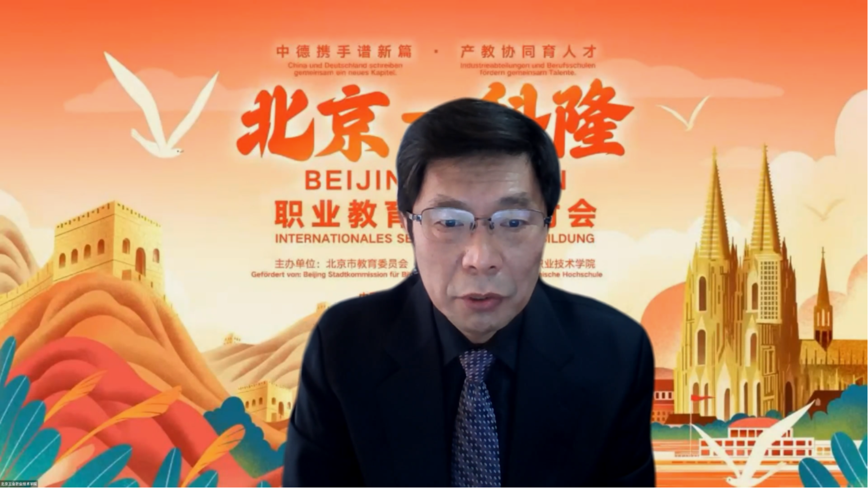 北京市教育委員會副主任孫其軍發表講話。他表示,兩個友城之間的教育交流與合作在過去35年深入發展,在師生流動、語言教學、人才培養、職教培訓等領域取得豐碩成果。他強調,科隆市作為德國第四大城市,歷史悠久、底蘊深厚,在職業教育方面有許多值得我們借鑒的經驗。希望未來以北京工業職業技術學院為代表的北京優秀職業院校,能夠在課程標準、師生互派、語言教學、國際會議、來華留學等方面進一步加強與科隆的交流與合作。相信以本次研討會為起點,必將開啟兩市未來務實高效合作的新篇章,產教融合、攜手共育更多的高素質國際化技術技能人才。