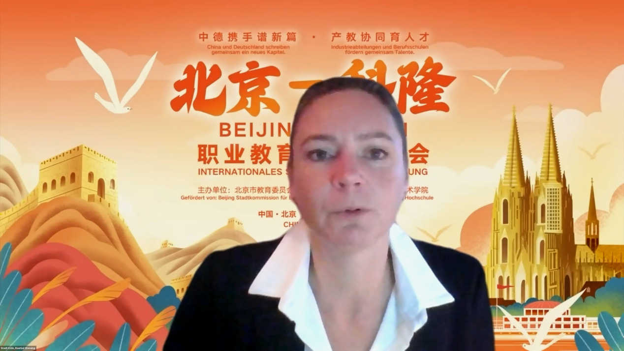 德國科隆市學校-職場過渡協調辦公室負責人BaerbelWensing女士在致辭中表示十分榮幸能代表科隆市政府教育部門出席此次北京-科隆職業教育領域的國際研討會。特別感謝主辦方和承辦單位為本次會議的順利召開付出的所有努力。本次研討會將會是一個新的起點,期待中德職教同仁以此為契機,進一步加強交流對話,在職教領域開展更多的務實合作。科隆市教育部門將一如既往地積極為兩市教育合作創造便利條件、營造良好氛圍,衷心期望兩市在職教領域開展更多密切合作、取得更加豐碩成果。