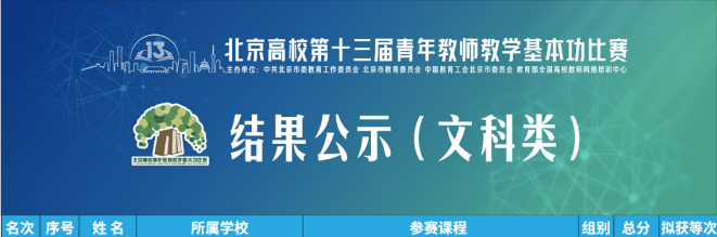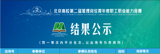 北京高校第十三屆青教賽和第二屆青管賽結果正式發布。北京高校第十三屆青教賽共有來自北京70余所高校312名教師參加,我校建筑與測繪工程學院李光子老師獲工科B組一等獎,體育部賈一老師獲文科B組三等獎;北京高校第二屆青管賽共有57所高校171名選手參加,我校教師史偉、賈宸、吳紫豪獲得B組三等獎。我校也成為北京高校第十三屆青教賽中唯一獲得工科B組一等獎的高職院校。