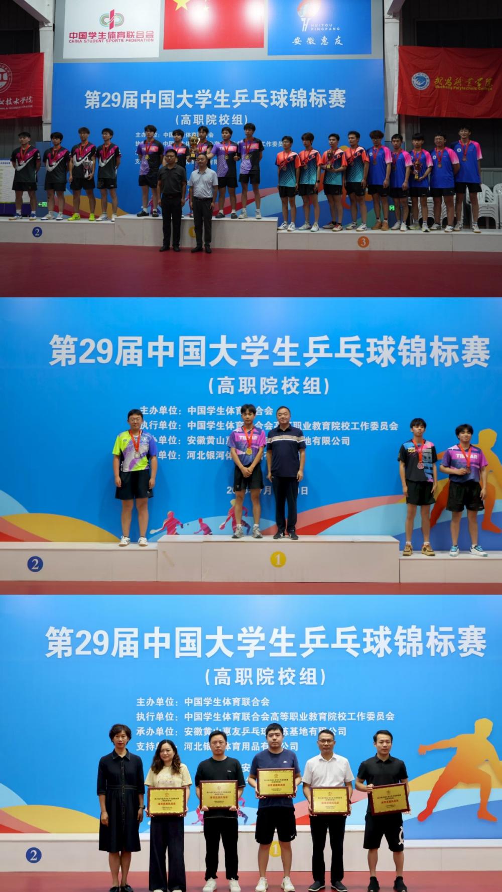7月15日-19日,第 29 屆中國大學(xué)生乒乓球錦標(biāo)賽(高職院校組)在安徽黃山舉行,本屆比賽匯集了全國高職院校的乒乓球傳統(tǒng)強(qiáng)隊(duì)。我校乒乓球隊(duì)在運(yùn)動(dòng)訓(xùn)練教研室主任賈一和教練員張斌老師帶領(lǐng)下,歷經(jīng)鏖戰(zhàn)交出了一份亮眼的答卷,勇奪男子團(tuán)體季軍和男子單打亞軍,取得歷史性的新突破。
