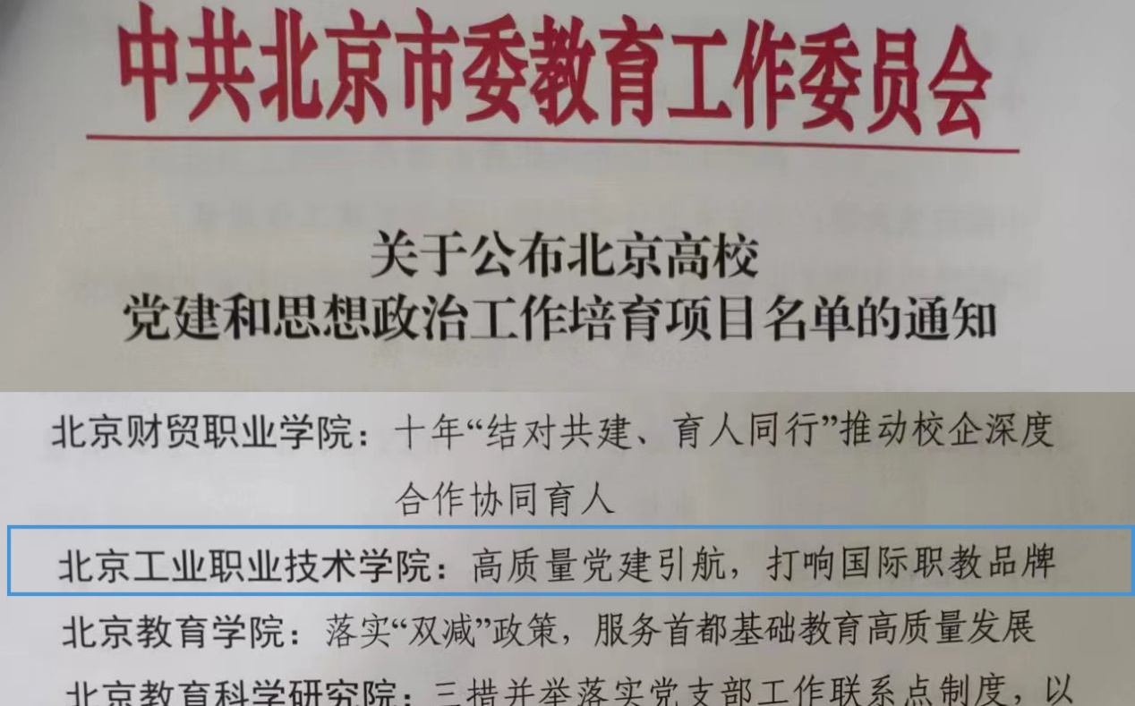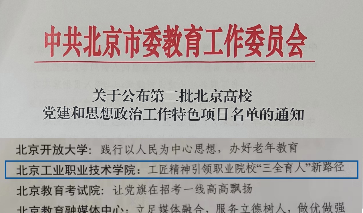 經《北京普通高等學校黨建和思想政治工作基本標準》集中檢查各檢查組推薦,市委教育工委遴選,我校《工匠精神引領職業院校“三全育人”新路徑》入選第二批北京高校黨建和思想政治工作特色項目(共25個)、《高質量黨建引航,打響國際職教品牌》入選北京高校黨建和思想政治工作培育項目(共39個)。