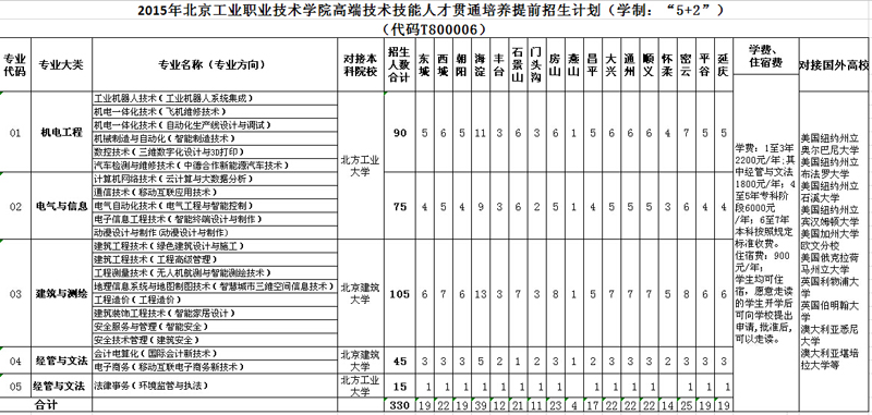 北京工業職業技術學院2015年七年制貫通培養提前招生項目集合了首都師范大學附屬中學、北京工業職業技術學院、英美等國外知名高校以及國內外各大型企業的優質教育資源。招生對象是符合2015年中考升學資格的本市正式戶籍考生,通過中考提前批招收的學生進入“外培班”(也稱國外培養計劃)。外培班的學生,五年后可到美國、英國、澳大利亞等國家知名學府學習,學生在國外學習期間享受政府專項經費支持。項目學制7年,包括“2年高中 3年高職 2年本科”三個階段,每個階段學習合格能獲得該階段的畢業證書,不參加高考也能拿到國內外知名大學的本科文憑。