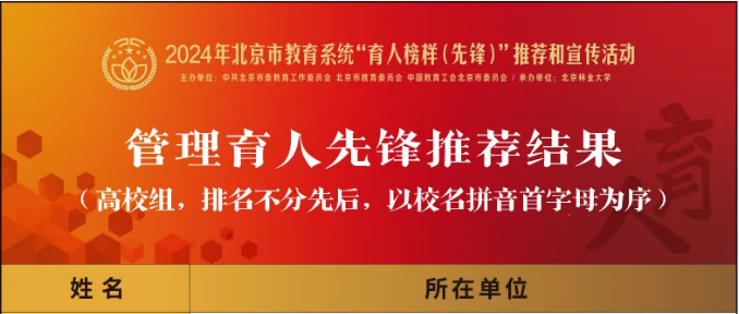 2024年北京市教育系統“育人榜樣(先鋒)”推薦和宣傳活動由中共北京市委教育工委、北京市教育委員會、北京市教育工會聯合開展。在學校黨委的統一部署下,我校開展了校級“育人先鋒”評選及北京市教育系統“育人榜樣(先鋒)”推薦工作。經相關程序,共評選出校級“育人先鋒”18人,并從其中推薦老師參評北京市教育系統“育人榜樣(先鋒)”。經過評比,最終我校6人榮獲北京市教育系統“育人先鋒”,這是我校“全員育人、全程育人、全方位育人”的生動實踐和重要成效。
