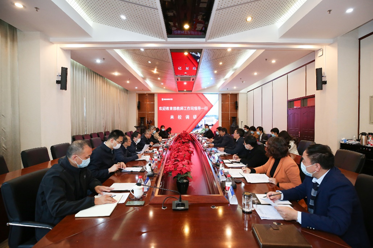10月19日下午,教育部教師工作司司長任友群、副司長黃小華、綜合處處長劉璇璇、發(fā)展處處長趙靜、保障處一級調(diào)研員童春林、管理處副處長劉揚(yáng)、發(fā)展處一級主任科員孫曉虎一行蒞臨我校調(diào)研指導(dǎo)教師隊(duì)伍建設(shè)情況。市委教育工委委員、市教委副主任孫其軍,人事處處長、二級巡視員楊江林,人事處副處長紀(jì)奇明等陪同調(diào)研。我校黨委書記高喜軍,黨委副書記、院長安江英,黨委常委、副院長馮海明以及人事處、教務(wù)處、招生就業(yè)處、機(jī)電工程學(xué)院、建筑與測繪工程學(xué)院、基礎(chǔ)教育學(xué)院等部門負(fù)責(zé)人和教師代表參加了交流座談。