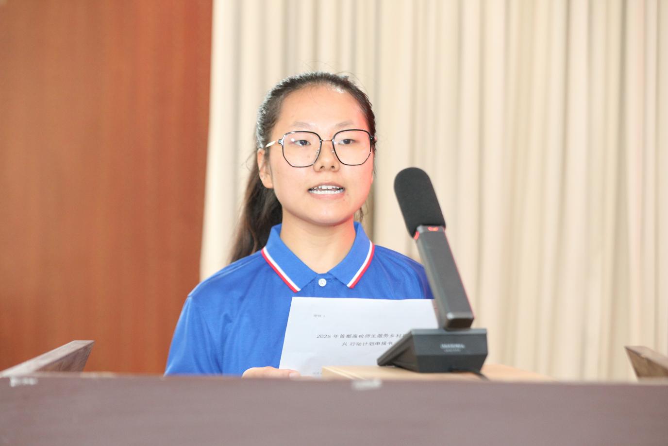 2025年暑期社會(huì)實(shí)踐團(tuán)學(xué)生代表法律事務(wù)2331王向肖發(fā)言。她介紹團(tuán)隊(duì)將赴門頭溝區(qū)妙峰山鎮(zhèn)隴駕莊村開(kāi)展實(shí)踐,針對(duì)該村作為北京唯一少數(shù)民族村的發(fā)展需求,結(jié)合法律專業(yè)特長(zhǎng),開(kāi)展法治宣傳、法律咨詢等服務(wù)。"我們將用通俗語(yǔ)言講好鄉(xiāng)村故事,用專業(yè)服務(wù)解答村民困惑,用青春力量守護(hù)鄉(xiāng)村安寧,讓法治種子在希望的田野生根發(fā)芽。"