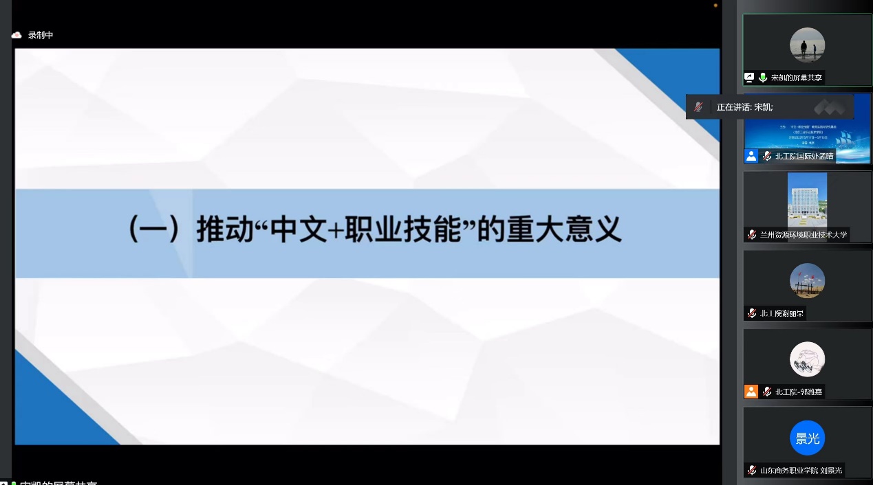 為貫徹落實中共中央辦公廳、國務院辦公廳印發《關于推動現代職業教育高質量發展的意見》,推動國際中文教育與職業教育“走出去”融合發展,構建“中文+職業技能”教育高質量發展新體系,5月17日至18日,北京工業職業技術學院“中文+職業技能”教育實踐與研究基地舉辦了“中文+職業技能”管理人員線上培訓,來自全國各地87所職業院校的262名校領導、國際處室負責人和教師參加了培訓。