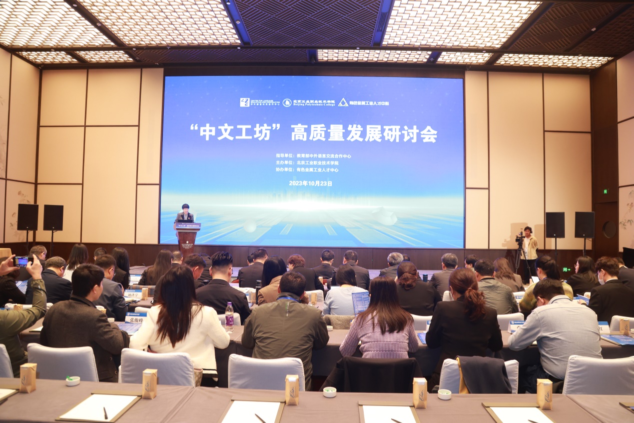 2023年10月23日,由教育部中外語(yǔ)言交流合作中心指導(dǎo)(以下簡(jiǎn)稱“語(yǔ)合中心”)、北京工業(yè)職業(yè)技術(shù)學(xué)院主辦、有色金屬工業(yè)人才中心協(xié)辦的“中文工坊”高質(zhì)量發(fā)展研討會(huì)在首鋼園召開(kāi)。教育部語(yǔ)合中心副主任胡志平、教育部語(yǔ)合中心亞非處高級(jí)項(xiàng)目主管吳磊、教育部職業(yè)教育發(fā)展中心國(guó)際合作與交流處負(fù)責(zé)人鄭堅(jiān)副研究員、有色金屬工業(yè)人才中心黨委書(shū)記、主任謝承杰、有色金屬工業(yè)人才中心黨委副書(shū)記、副主任宋凱、北方礦業(yè)有限責(zé)任公司總經(jīng)理助理徐敬元、北京師范大學(xué)宋繼華教授等領(lǐng)導(dǎo)及專家以及來(lái)自全國(guó)21家“中文工坊”的參建院校及企業(yè)代表應(yīng)邀出席。我校黨委副書(shū)記、院長(zhǎng)安江英,黨委常委、副院長(zhǎng)周燕及相關(guān)人員共同出席本次研討會(huì)。本次研討會(huì)以線上線下同步的方式舉行,會(huì)議由我校副院長(zhǎng)周燕主持。