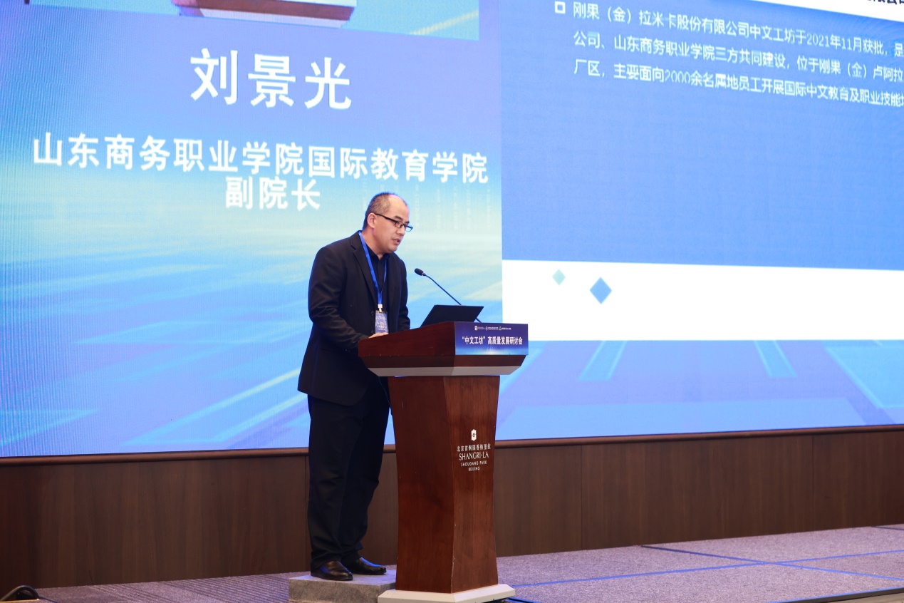 山東商務(wù)職業(yè)學(xué)院副院長(zhǎng)劉景光作題為《高職院校參與中文工坊建設(shè)的探索與實(shí)踐—以山東商務(wù)職業(yè)學(xué)院為例》的主旨報(bào)告