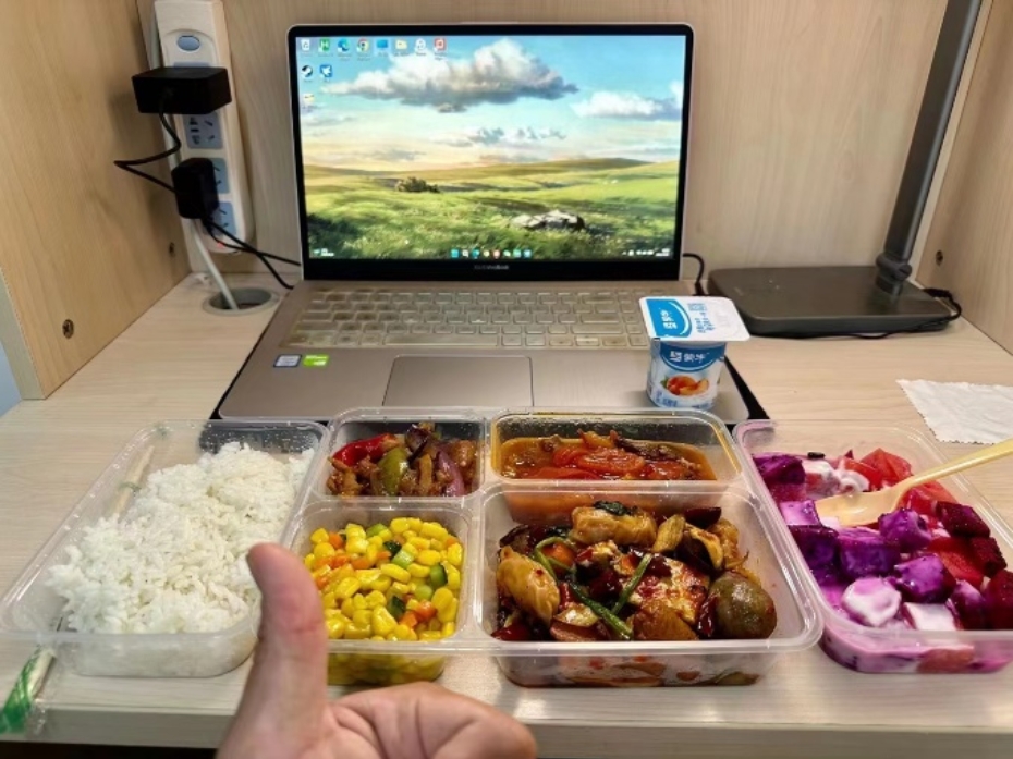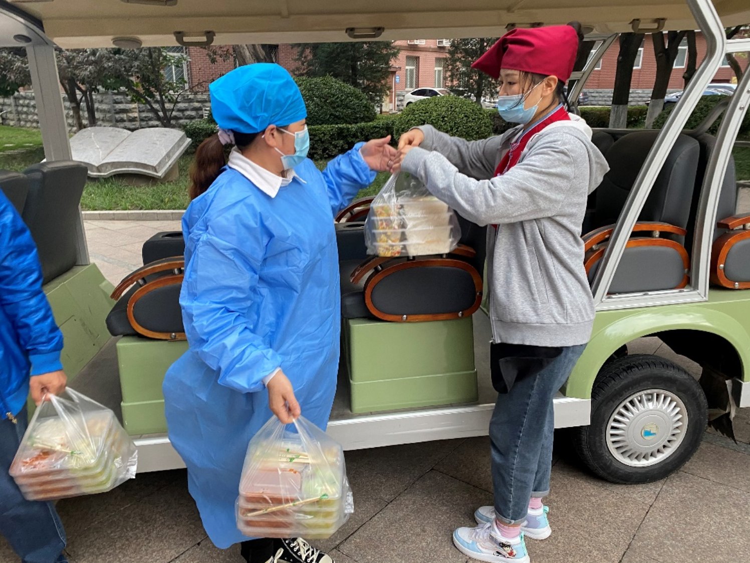 集中健康監測開始以來,每到飯點,就能看見這樣一群身影,飲食中心的工作人員或步行或騎車,按時來到健康驛站,將熱騰騰的飯菜交給驛站值守的工作人員,值守人員兩兩分組,默契配合,清點好餐食后,拉著小推車每層樓、每間房地給學生分餐送餐,他們送去的不僅僅是一份可口的餐食,也是一份暖心的關愛。8月28日開始,飲食服務中心已經為健康驛站運送隔離餐4625人次,每日想方設法為同學們變換菜色和口味,保證能量供給。中秋節當日,學校還為健康驛站的同學們和工作人員準備了愛心月餅和中秋節祝福,撫慰了師生不能與家人團圓的思念之情,也進一步堅定了全校師生打贏疫情防控阻擊戰的信心和決心。