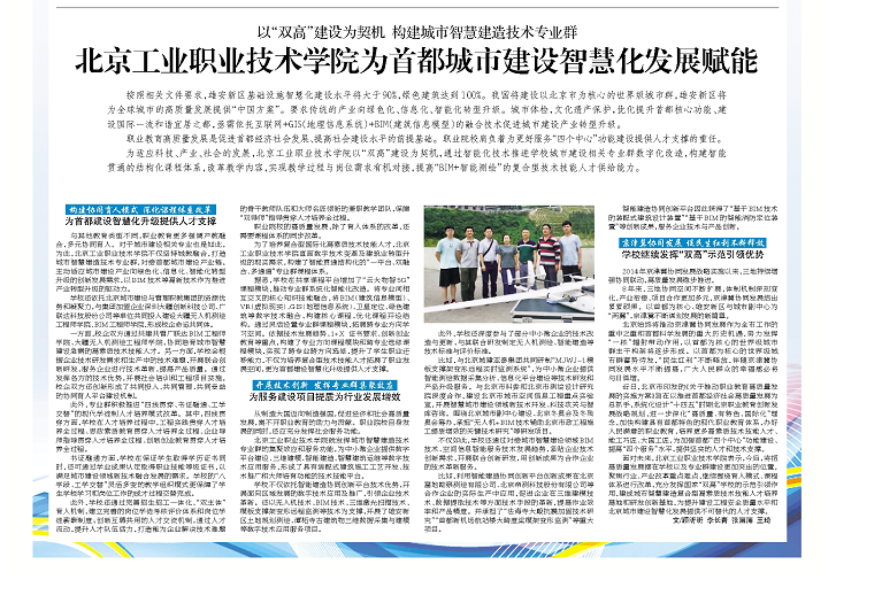 《北京日報》6月11日以《以“雙高”建設為契機構建城市智慧建造技術專業群—北京工業職業技術學院為首都城市建設智慧化發展賦能》為題,詳細報道我校“雙高”建設的經驗和成果。報道聚焦“構建協同育人模式深化課程體系改革為首都建設智慧化升級提供人才支撐”“開展技術創新并發揮專業群集聚效應 為服務建設項目提質為行業發展增效”“京津冀協同發展促民生紅利不斷釋放學校繼續發揮‘雙高’示范引領優勢”三各方面,系統介紹了我校作為國家“雙高”學校在課程體系改革、專業群數字化改造、技術創新、服務社會等方面發揮的示范引領作用。