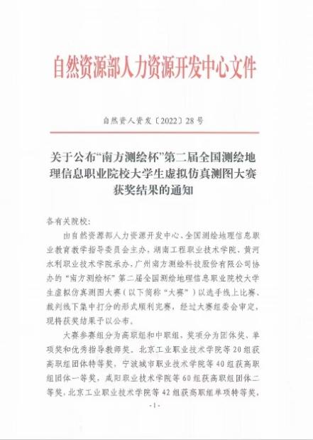 近日,“南方測繪杯”第二屆全國測繪地理信息職業(yè)院校大學(xué)生虛擬仿真測圖大賽在湖南工程職業(yè)技術(shù)學(xué)院舉辦。來自29個(gè)省份260余所學(xué)校的1000多名選手在線上進(jìn)行激烈角逐,參賽省市多、院校多、學(xué)生多,競爭更加激烈。通過一天的緊張比賽,最終我校參賽的兩個(gè)隊(duì)伍在500多個(gè)隊(duì)伍中以第1名和第6名成績獲得2個(gè)單項(xiàng)特等獎,并以參賽院校第一名成績獲得團(tuán)體特等獎,夏廣玲老師、鄭佳榮老師獲得優(yōu)秀指導(dǎo)教師。湖南新聞報(bào)道了這一比賽盛況及成績。