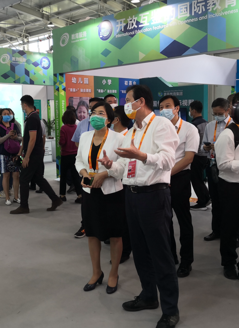 原教育部副部長、中國教育國際交流協會會長劉利民在北京市教委一級巡視員黃侃以及我校校領導的陪同下到我校展位觀展指導