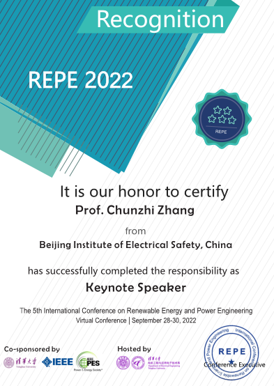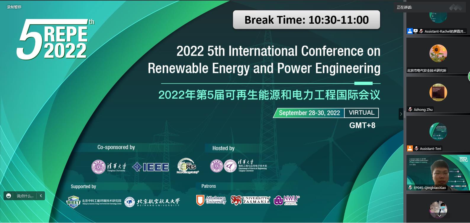 2022年9月28-30日,第五屆可再生能源和電力工程國際會議(REPE)在北京召開, 會議由清華大學主辦,北京中科工能環境技術研究院、北京航空航天大學協辦,清華大學電機工程與應用電子技術系承辦,并以網絡形式成功舉辦。會議定位為可再生能源和電力工程應用技術及產業化發展交流探討,面向智能技術企業和科研院所研發人員、工程師、市場開拓者和行業組織,涉及內容為可再生能源和電力工程應用技術發展趨勢、應用模式、商業模式、創業經驗等。本次會議有來自世界各地的近百位學者和專家共同出席,我校電研所所長張春芝教授在本次會議上做了主旨報告。