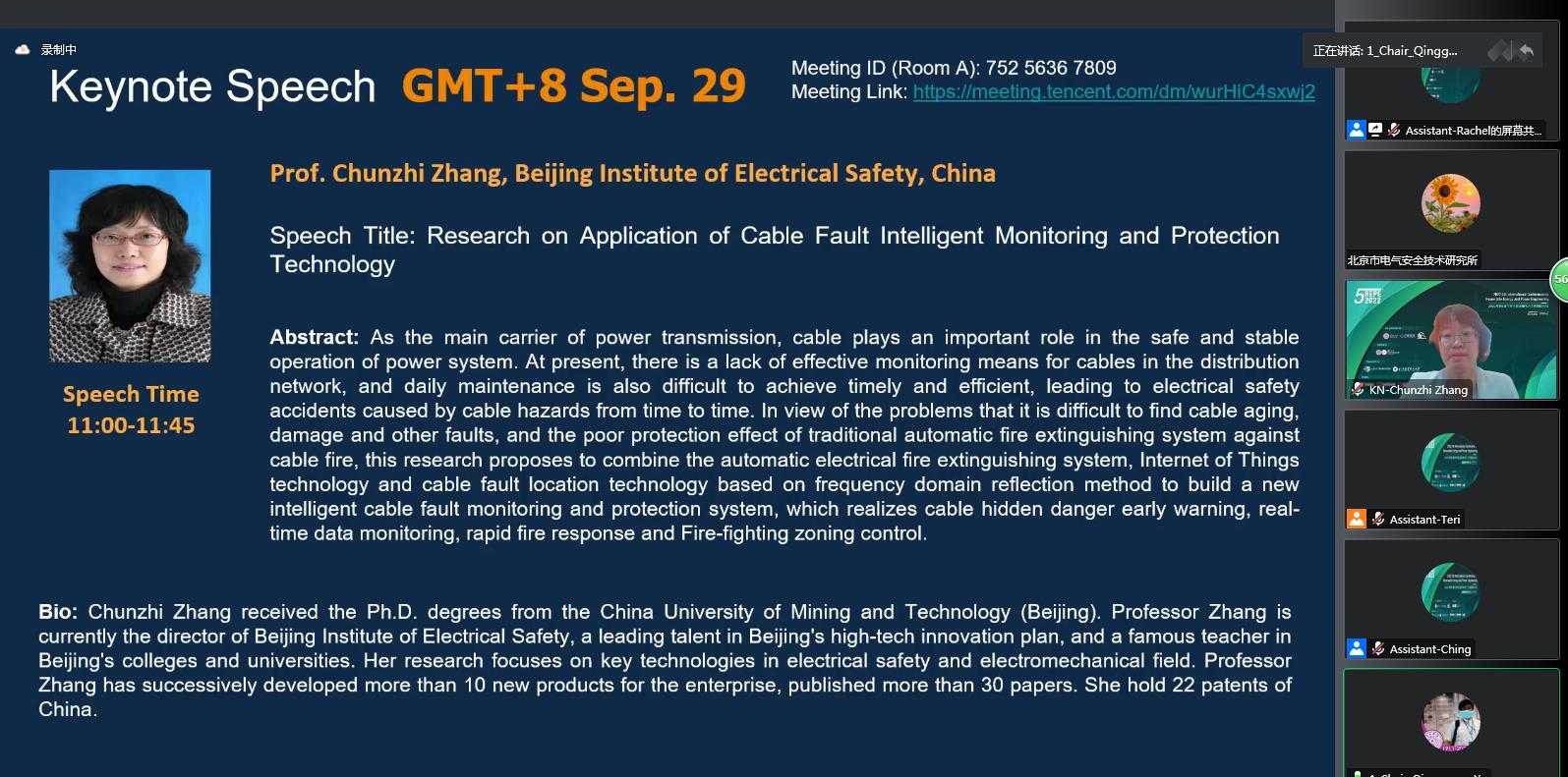 我校電研所作為電氣安全領域的代表受邀參加了此次會議論壇。本次會議分為主論壇和八個分論壇,機電工程學院院長、電研所所長張春芝教授在主論壇作了題為《電纜故障智能監測與防護技術應用研究》的報告,與來自廣東工業大學、華南理工大學、帝國理工學院的專家同臺做主旨報告。