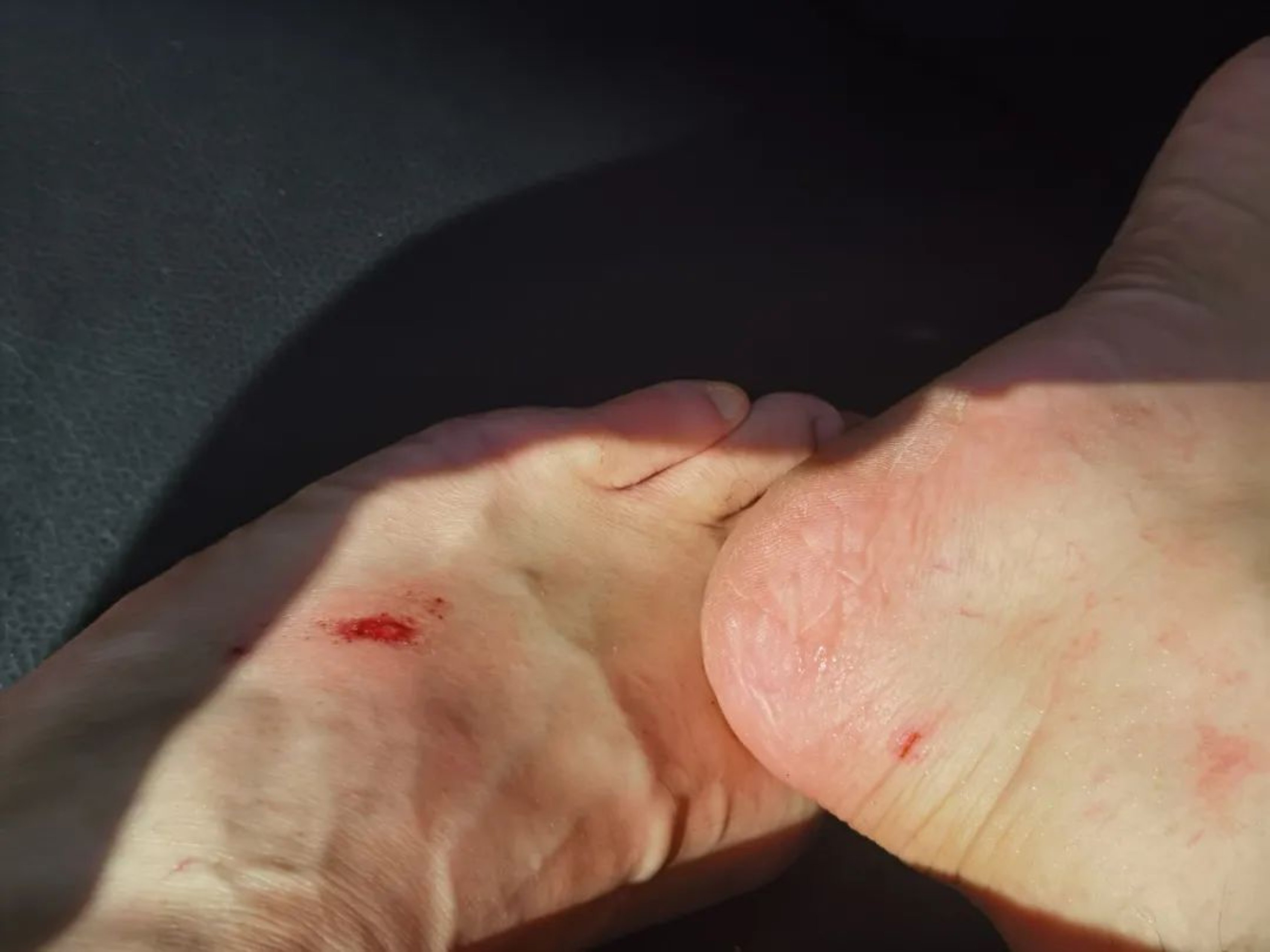 第二天,水位下降到膝蓋處,他們又一次出發,趟過湍急的河水,步行了近2個小時,終于到達了清水鎮政府,匯報了村里的整體情況,隨后村里的“生命通道”修通了。回到村后,村民看到一瘸一拐的陳甜,詢問后才知道,雨鞋不合腳,膠皮偏硬,長距離的步行將腳背磨破,滲出鮮血,腳底磨出兩個水泡?!爸灰罕姲踩?,我流點兒血算什么!”陳甜絲毫沒有在意身上的傷痛。
