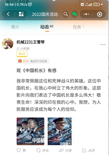 懿來讀書社舉辦紅色經典影片觀影交流打卡活動,組織同學們在“十一”期間觀看紅色經典影片、交流觀影體會,展現青年學生愛國愛黨的精神風貌。