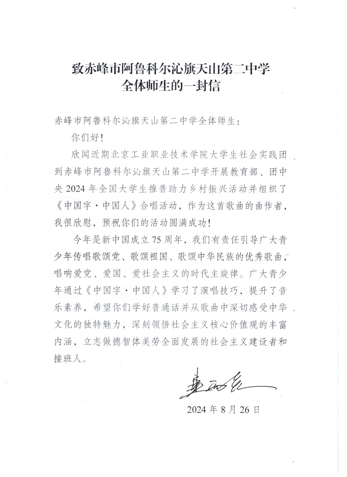 共唱一首歌。實踐團成員帶領學生共唱《中國字·中國人》,引導同學們要“寫好中國字,做好中國人”,并帶領學生共同練習手勢操。本次實踐活動得到了該首歌曲曲作者、著名作曲家連向先先生的來信鼓勵,使同學們備受鼓舞。