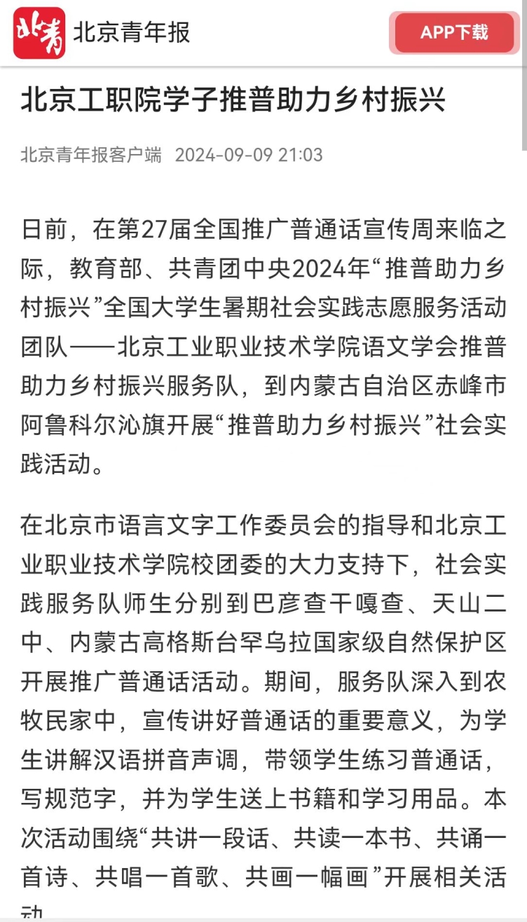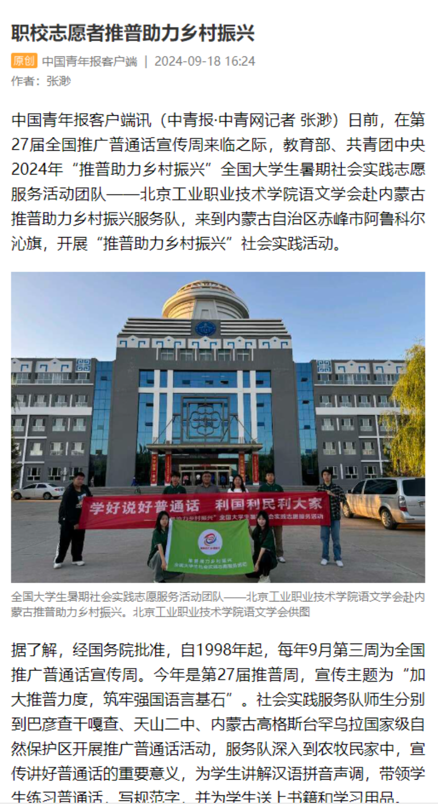 日前,在第27屆全國推廣普通話宣傳周來臨之際,教育部、共青團中央2024年“推普助力鄉村振興”全國大學生暑期社會實踐志愿服務活動團隊——北京工業職業技術學院語文學會赴內蒙古推普助力鄉村振興服務隊到內蒙古自治區赤峰市阿魯科爾沁旗開展“推普助力鄉村振興”社會實踐活動。將語言之美與文化之韻、文字之美與音樂之情深度融合,加深少數民族地區對中華優秀傳統文化的深刻認識,鑄牢中華民族共同體意識,讓各民族同學的心更近,情更真,義更濃。本次社會實踐活動得到了《中國教育報》《中國青年報》《現代教育報》《北京青年報》的關注和報道。