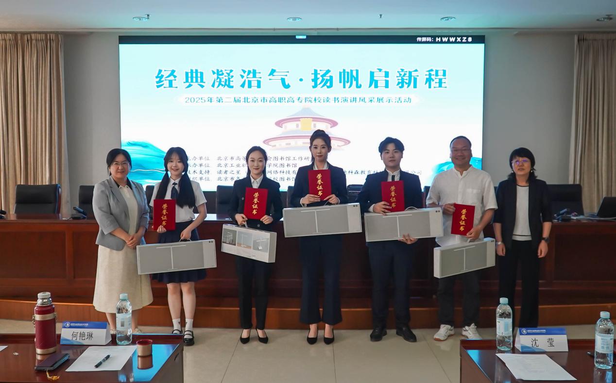 5月22日,由北京市高等教育學會圖書館工作研究分會主辦,我校圖書館承辦的2025年第二屆北京市高職高專院校讀書演講風采展示活動決賽在匠心樓3層報告廳順利舉辦。黨委常委、副院長沈瑩,圖書館館長李月清、民政職業大學信息與教育技術中心(圖書館)主任楊濤、北京財貿職業學院圖書館與信息技術中心主任尋云杰、北京政法職業學院圖書館館長趙春燕、北京農業職業學院圖書館館長何艷琳、北京衛生職業學院圖書館館長段麗敏、北京青年政治學院圖書館館長王玉霞、北京勞動保障職業學院圖書館館長張穎出席本次決賽。