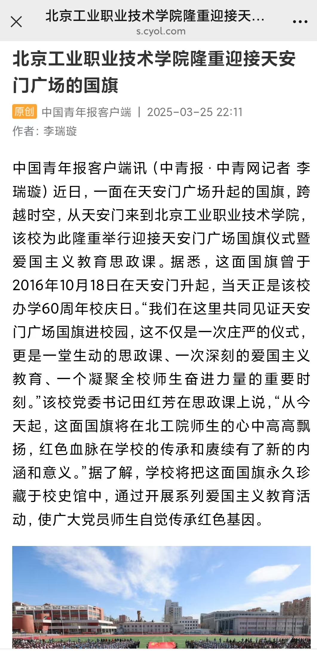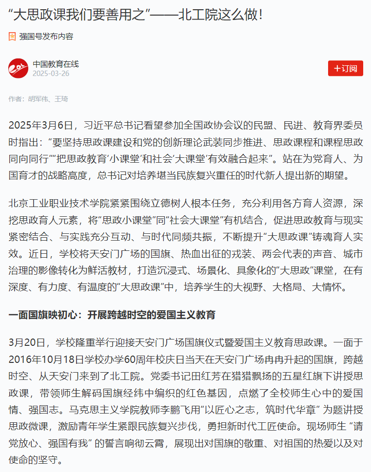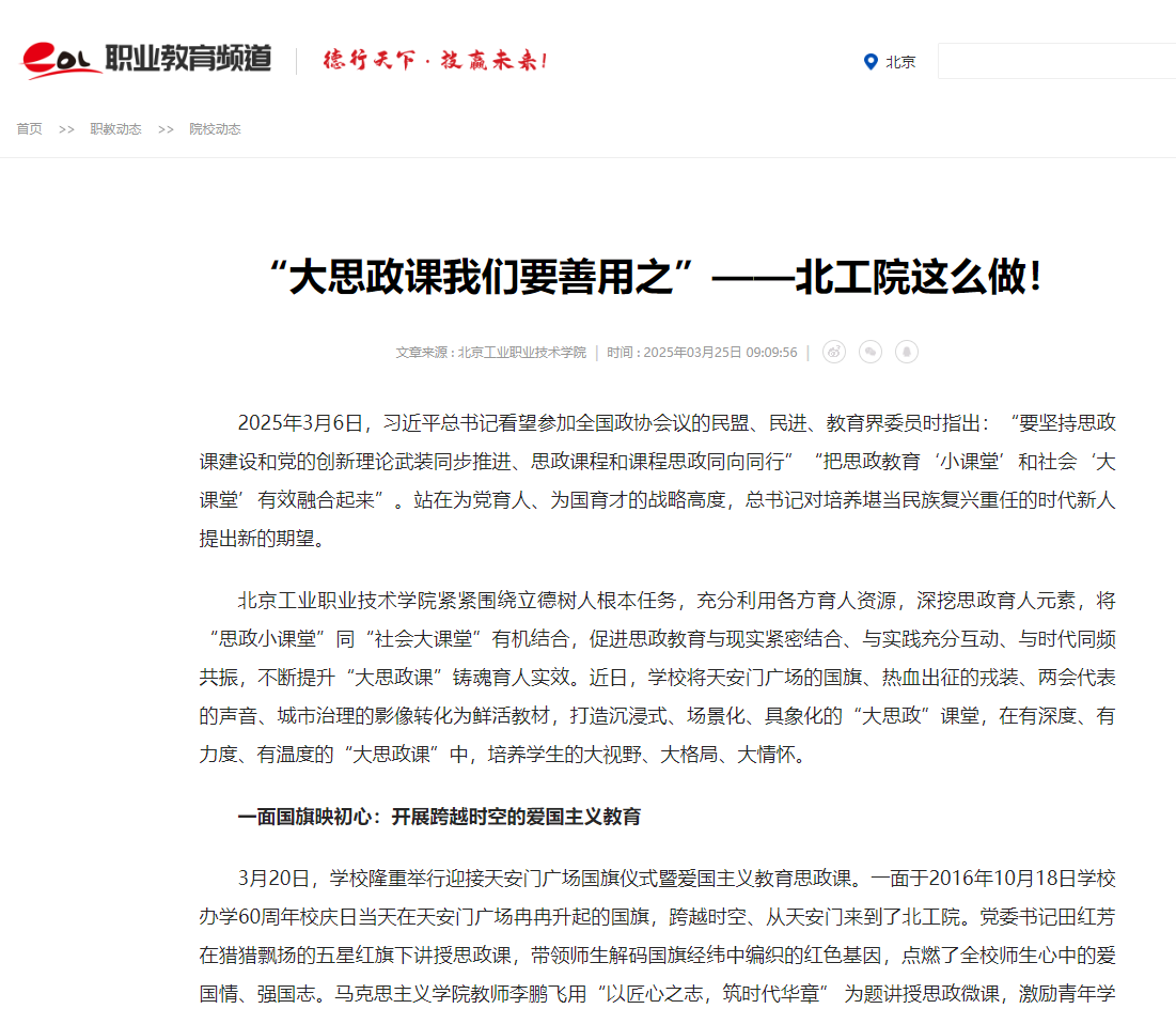 2025 年 3 月 6 日,習近平總書記在看望參加全國政協會議的民盟、民進、教育界委員時強調:“要堅持思政課建設和黨的創新理論武裝同步推進、思政課程和課程思政同向同行”“把思政教育‘小課堂’和社會‘大課堂’有效融合起來”。北京工業職業技術學院深入貫徹習近平總書記對學校思政課建設的重要指示精神,積極探索契合職業院校學生認知特點的 “大思政課” 綜合改革。近期,學校別出心裁地將天安門廣場的國旗、熱血出征的戎裝、“兩會”代表的聲音、城市治理的影像轉化為生動教材,打造沉浸式、場景化、具象化的 “大思政” 課堂,這一創新實踐成果引發中國青年報、北京日報、中國教育在線、學習強國等主流媒體的集中報道。現將相關報道全文轉載如下: