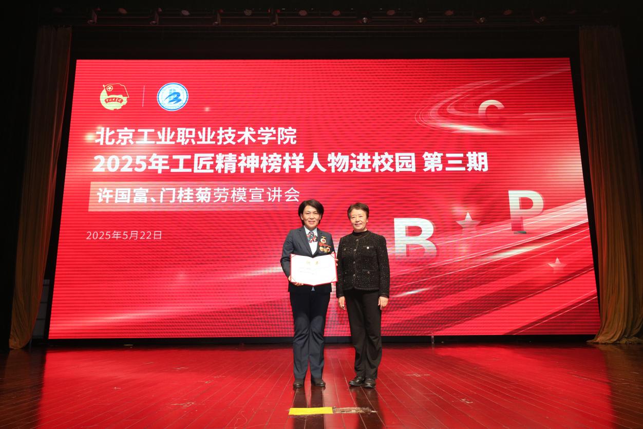 活動伊始,田紅芳向門桂菊、許國富授予 “工匠精神思政導師” 聘書,標志著兩位勞模正式成為校園匠心傳承的引路人。學生代表獻上鮮花,現(xiàn)場掌聲雷動,展現(xiàn)青年學子對勞模精神的崇高敬意。