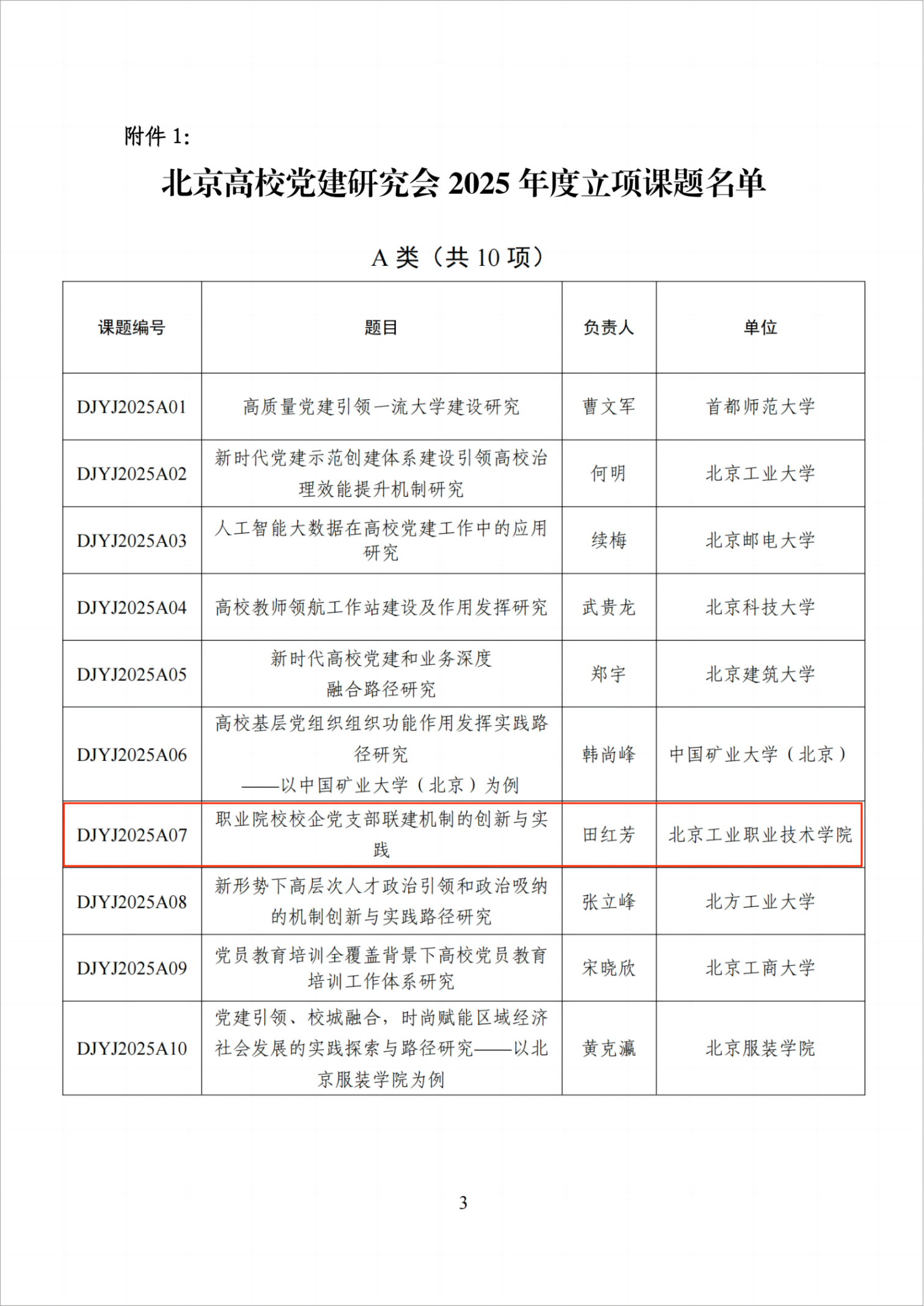 5月30日,北京高校黨建研究會(huì)公布了2025年度研究課題立項(xiàng)名單,由黨委書記田紅芳作為負(fù)責(zé)人申報(bào)的《職業(yè)院校校企黨支部聯(lián)建機(jī)制的創(chuàng)新與實(shí)踐》獲批立項(xiàng),立項(xiàng)類別為 A類。