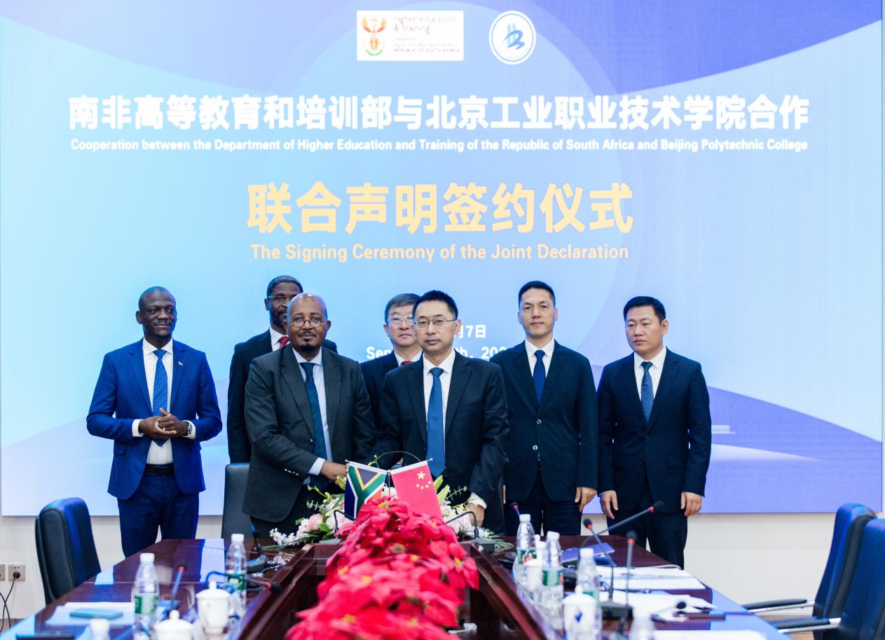 9月7日上午,南非高等教育與培訓(xùn)部與我校合作聯(lián)合聲明簽約儀式在我校匠心樓第四會(huì)議室舉行。南非高等教育與培訓(xùn)部總司長恩科西納西·西西、特別顧問克拉倫斯·齊特雷克、國際司司長索拉尼·庫馬洛爾等出席了簽約儀式。西西總司長與我校黨委副書記、院長柳長安作為締約雙方代表簽署了《南非高等教育與培訓(xùn)部與我校合作聯(lián)合聲明》(以下簡稱“聯(lián)合聲明”)。中國教育部職業(yè)教育與成人教育司副司長李智、北京市教育委員會(huì)副主任魏旭斌等共同見證了該項(xiàng)聯(lián)合聲明的簽署。中國教育部職業(yè)教育與成人教育司長綜合改革處一級(jí)調(diào)研員李紅東、北京市教育委員會(huì)國際合作與交流處副處長胥丹丹等也一同參加了簽約儀式。簽約儀式由我校黨委常委、副院長周燕主持。
