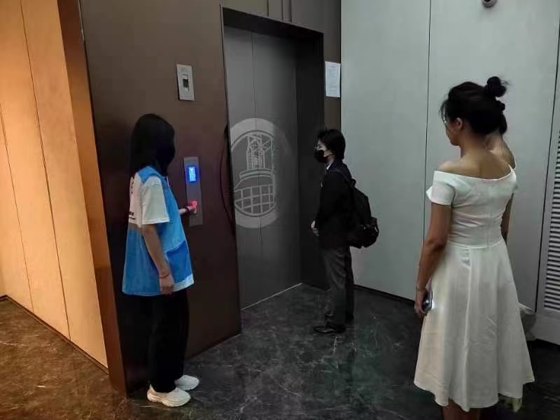 在會場內,志愿者引導參會人員下車入樓并乘坐電梯進入會場。