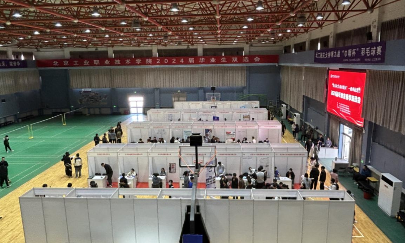 根據北京市教委《關于開展“青春向黨,就業報國—春季就業服務季”活動的通知》和北京工業職業技術學院《2024年畢業生就業促進工作方案》的要求,為了更好地滿足用人單位的人才需求,促進畢業生充分、高質量就業,4月15日下午,北京工業職業技術學院2024屆畢業生春季雙選會在我校體育館內舉行,共吸引各行業50余家用人單位,1000余名學生參加本次雙選會。此次雙選會得到了校領導的高度重視,黨委書記高喜軍,黨委副書記、院長柳長安,黨委常委、副院長沈瑩,黨委常委、副院長高世吉,黨委常委、紀委書記錢偉等校領導和各二級學院負責人都親臨現場與企業進行交流。