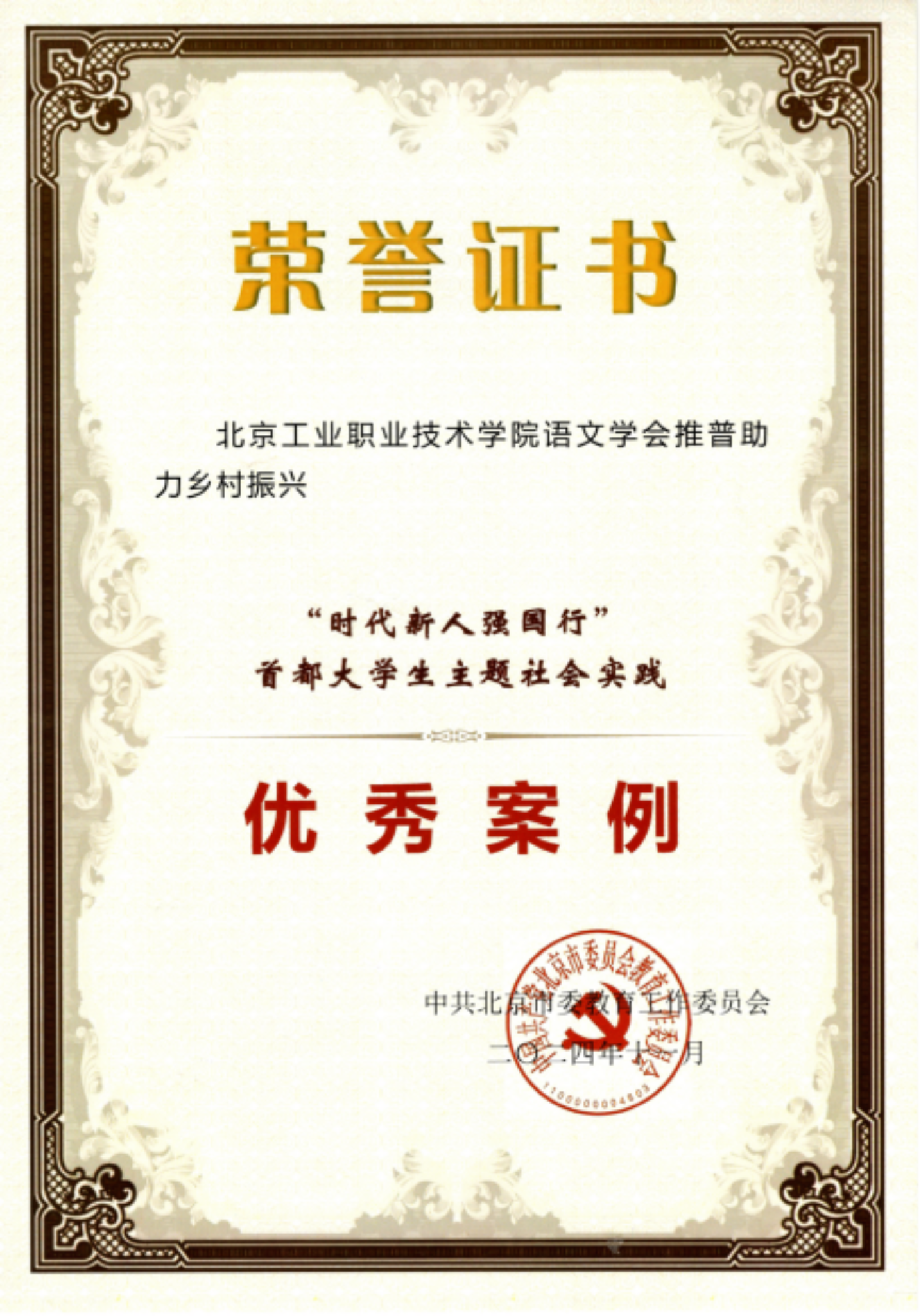 近日,中共北京市委教育工作委員會公布“時代新人強國行”首都大學生主題社會實踐優秀案例獲獎名單,由基礎教育學院葛東雷擔任指導教師、學生社團語文學會申報的示范項目《北京工業職業技術學院語文學會推普助力鄉村振興》獲批為優秀案例。此項目申報基礎為語文學會2024年獲批的教育部、團中央“推普助力鄉村振興”全國大學生暑期社會實踐志愿服務活動。