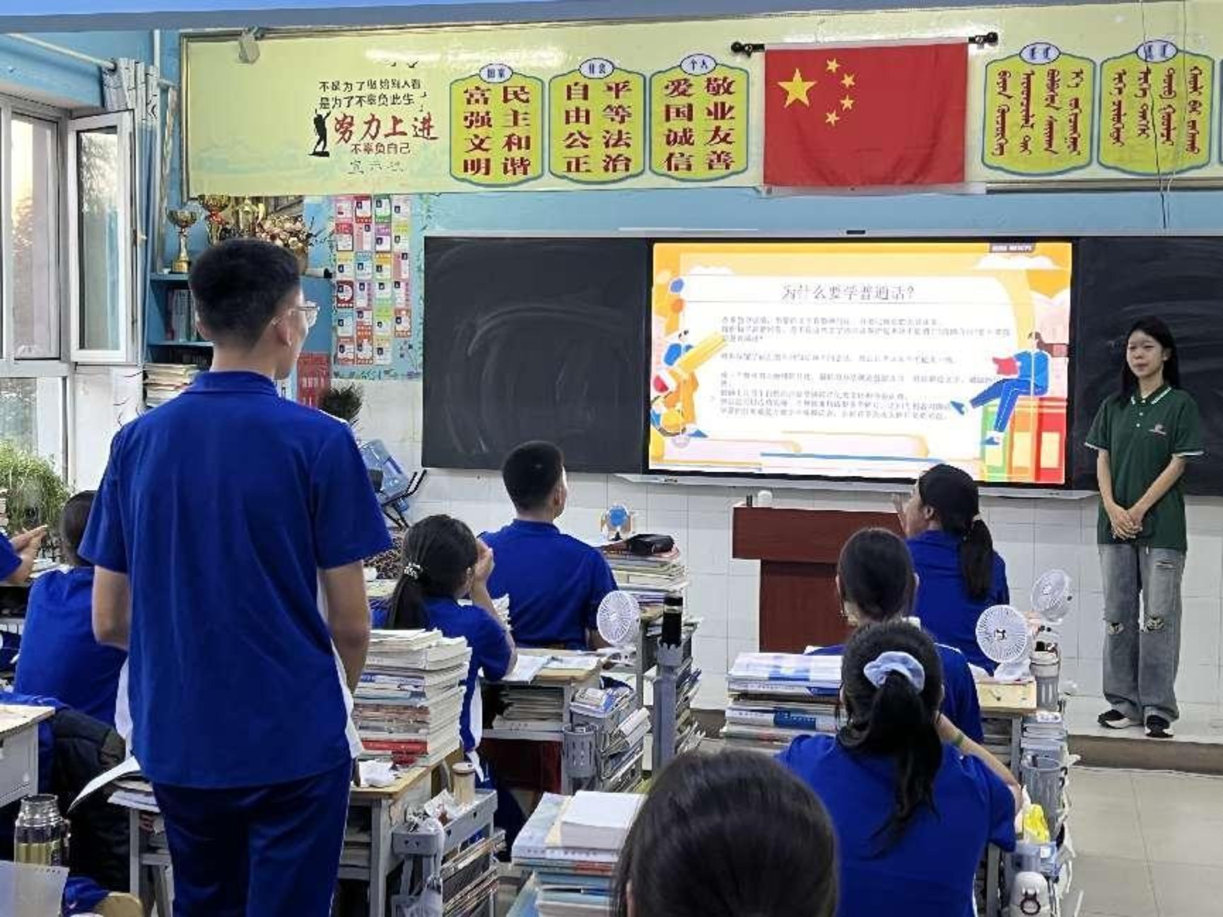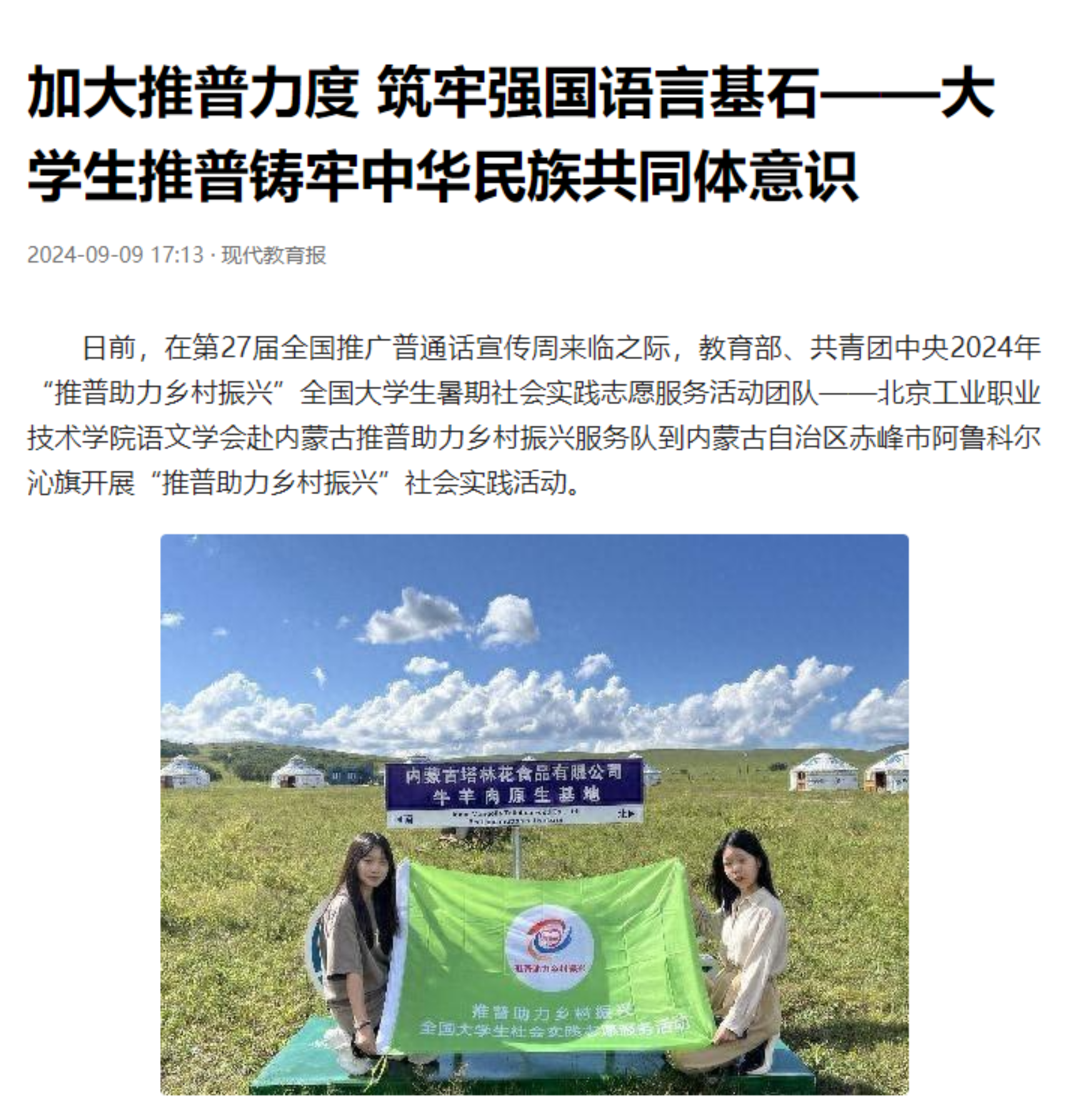 語文學會已連續三年獲批教育部、團中央“推普助力鄉村振興”全國大學生暑期社會實踐志愿服務活動團隊,此項指標為首輪“雙高”校驗收指標,我校也是三年來北京市唯一獲批此項目的高職院校。2024年實踐團隊赴內蒙古自治區赤峰市阿魯科爾沁旗牧區和學校開展推普活動,活動圍繞“共講一段話、共讀一本書、共誦一首詩、共唱一首歌、共畫一幅畫”開展相關活動,將語言之美與文化之韻、文字之美與音樂之情深度融合,加深少數民族地區對中華優秀傳統文化的深刻認識,鑄牢中華民族共同體意識,讓各民族的心更近,情更真,義更濃。本次社會實踐活動先后得到了《中國教育報》《中國青年報》《北京青年報》《現代教育報》的報道。