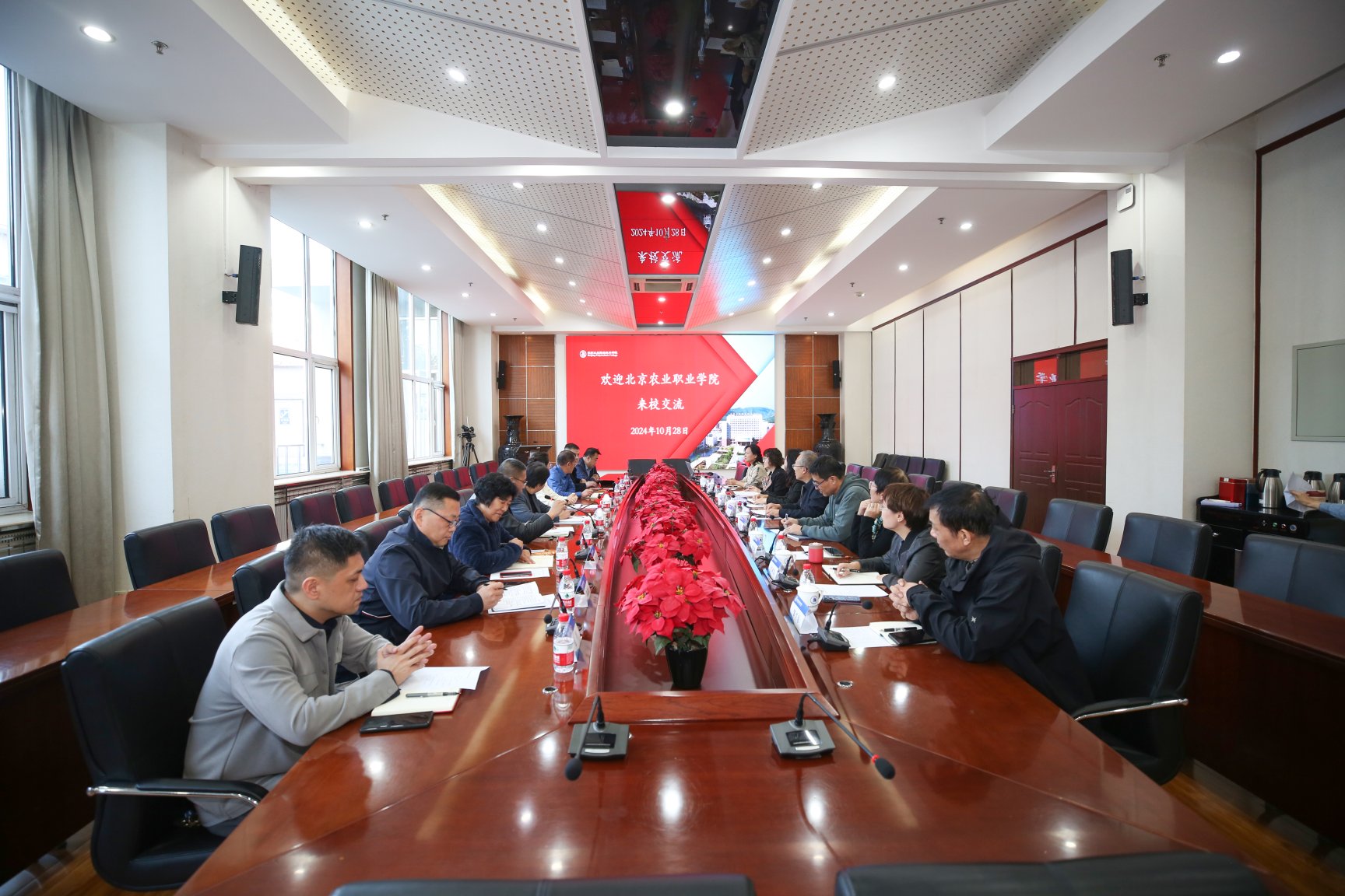 10月28日下午,北京農(nóng)業(yè)職業(yè)學(xué)院黨委副書記魯雷,黨委常委、副院長丁國亮,相關(guān)職能部門負(fù)責(zé)人等一行8人來校調(diào)研交流,深化校際合作,共謀高質(zhì)量發(fā)展。我校黨委書記田紅芳,黨委常委、副院長沈瑩,以及相關(guān)部門負(fù)責(zé)人熱情接待來訪客人,并進(jìn)行座談。黨委常委、副院長高世吉主持座談。