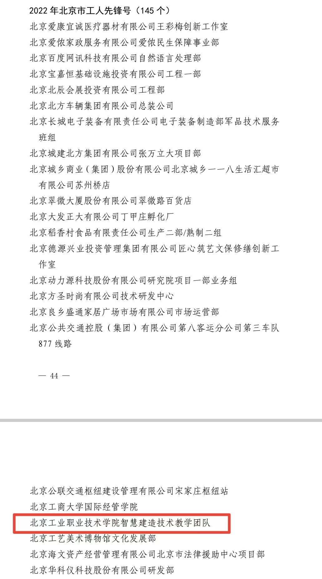 近日,北京市總工會、北京市人力資源和社會保障局表彰了一批為首都經濟建設、政治建設、文化建設、社會建設、生態文明建設和黨的建設作出突出貢獻的先進集體和先進職工,我校建筑與測繪工程學院智慧建造技術教學團隊被授予北京市2022年“工人先鋒號”榮譽稱號。