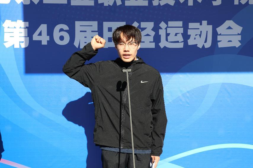 在宣誓環節,運動員代表、裁判員代表進行莊嚴宣誓。田紅芳宣布北京工業職業技術學院第46屆田徑運動會正式開幕,運動場瞬間沸騰。