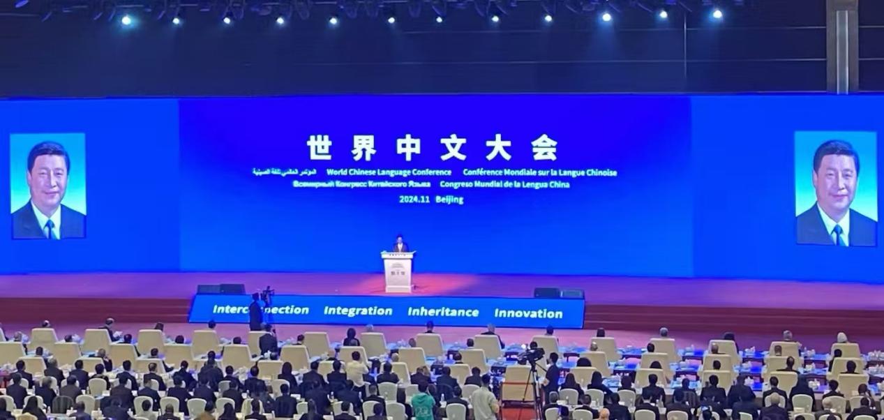 11月15日下午,由教育部主辦,中外語言交流合作中心、中國國際中文教育基金會、世界漢語教學學會共同承辦的2024世界中文大會在北京國家會議中心開幕。國家主席習近平向世界中文大會致賀信并祝賀孔子學院成立20周年。國家副主席韓正出席大會開幕式,宣讀習近平主席賀信并致辭。本次世界中文大會的主題為“聯通融合,傳承創新”,來自160余個國家和地區的2000多名政府官員、校長、專家學者、師生代表和駐華使節等出席會議。我校黨委書記田紅芳,黨委副書記、院長柳長安作為正式代表受邀參加大會開幕式。
