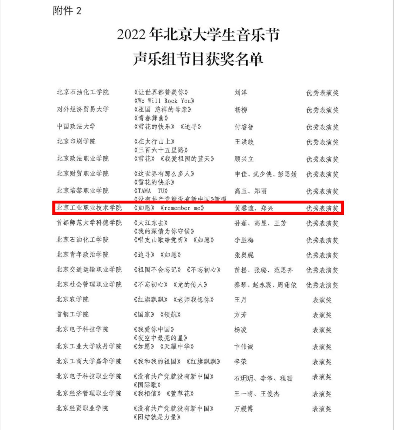 近日,由市委教育工委、市教委舉辦的2022年北京大學(xué)生音樂節(jié)系列活動落下帷幕。本屆音樂節(jié)共有來自北京的66所高校、322作品參賽。經(jīng)過激烈角逐,我校“夢之聲”合唱團(tuán)表演的作品《如愿》、《remember me》受到了專家評委的高度評價(jià),在2022年北京市大學(xué)生音樂節(jié)聲樂組獲得優(yōu)秀表演獎(jiǎng)。