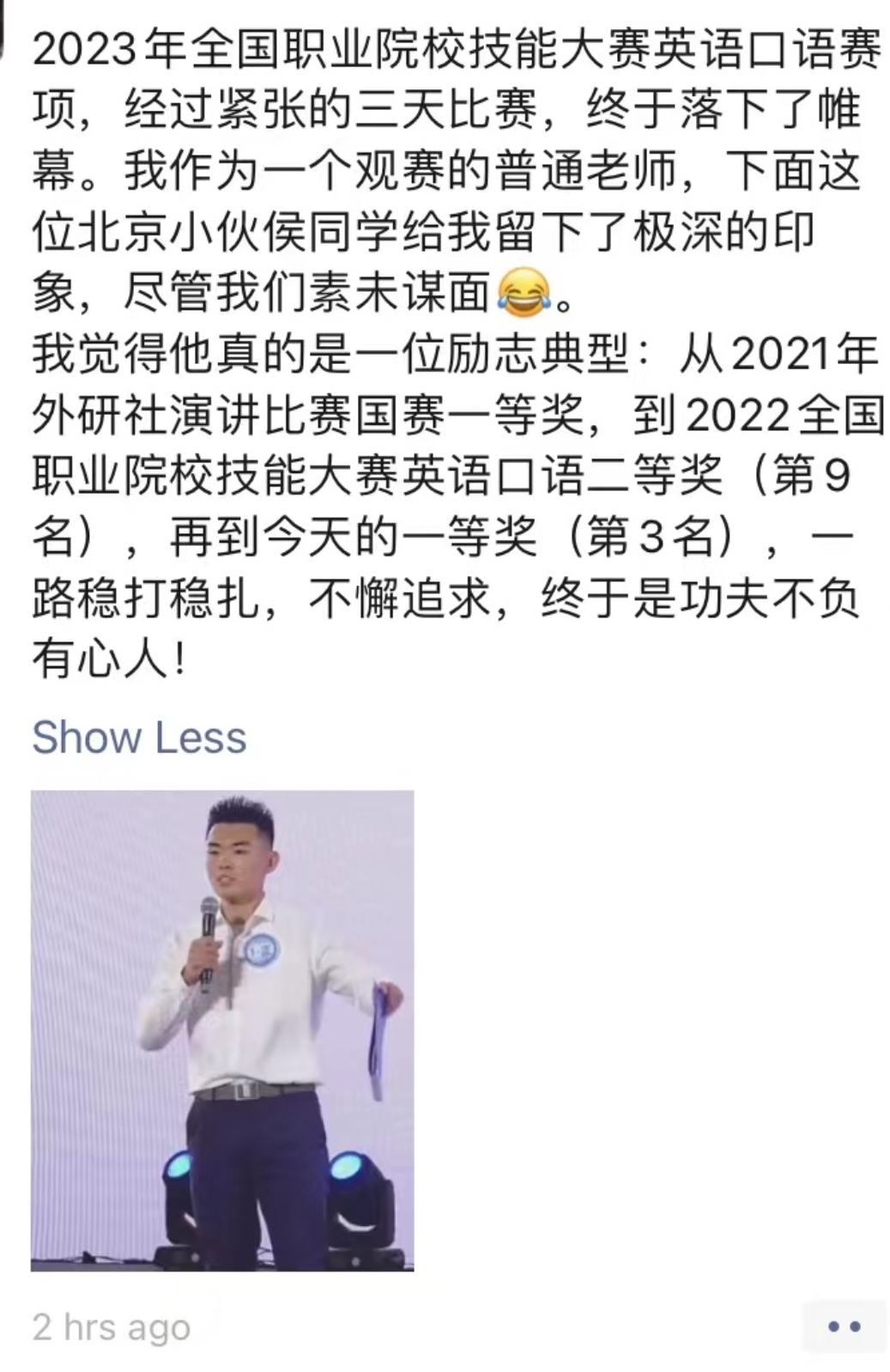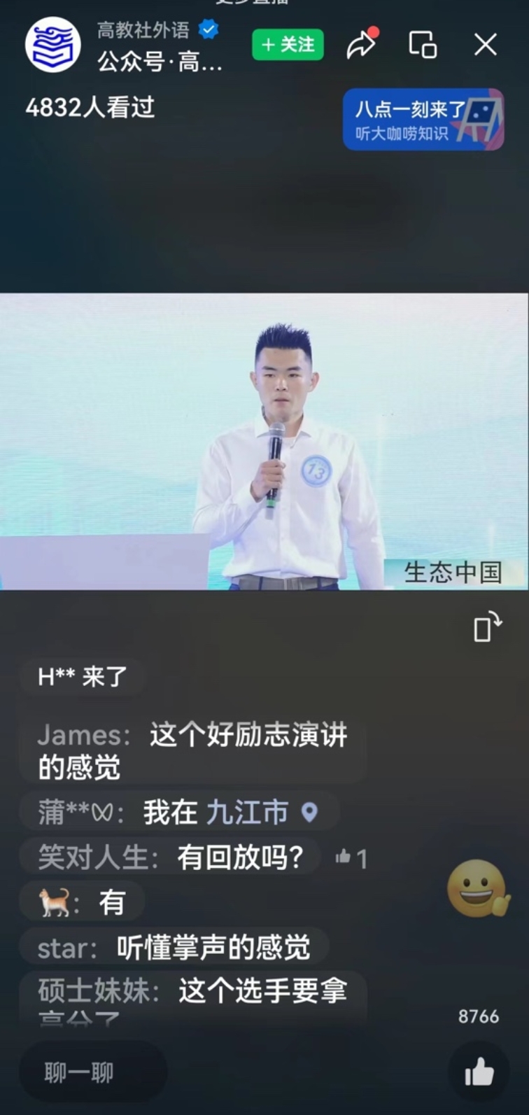 人民網、新華網、光明網、中國網、中國教育電視臺、江西電視臺、江西教育電視臺、《中國教育報》等多家媒體單位報道或轉載了賽況。大賽通過教育部中國大學生在線官方微博、“高教社外語”視頻號、高教云平臺進行了同步直播,150萬人次在線觀摩大賽盛況。侯明軒同學以流利的表達、地道的發音、自信得體的舉止、強大的氣場以及正直向上的優秀品質,獲得線上線下觀摩人員的一致好評,被觀眾親切地稱為“海軍勵志小哥哥”,從2021年到2023年穩扎穩打、步步為營、精益求精的參賽經歷更是職業院校工匠精神的體現,引起全國師生關注,展現了北京工業職業技術學院學子的風采,體現我校的育人成果。