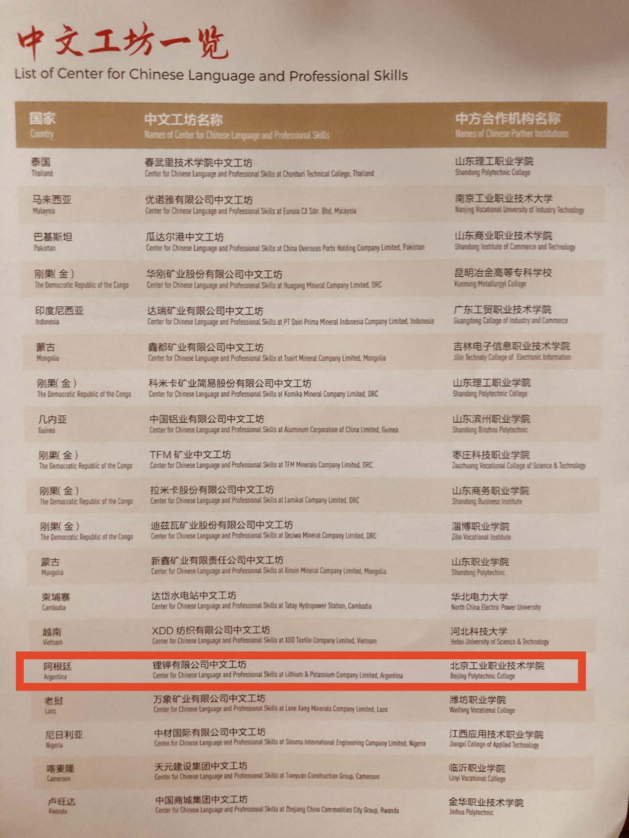 作為西藏珠峰間接控股孫公司,阿根廷鋰鉀有限公司自2018年初進入阿根廷鋰資源市場以來,作為鋰資源海外市場“走出去”的排頭兵,經過5年的扎根經營,在當地已具備了良好的發展基礎。但是企業在進一步深度發展過程中遇到了較大的人才“瓶頸”問題,即當地雇員中文和技術技能有限、存在跨文化溝通障礙等難題,亟需中文教育和職業教育配套“走出去”,提升當地一線員工的專業技術技能,實現當地一線技術和管理人才培養與企業項目具體需求的精準對接。