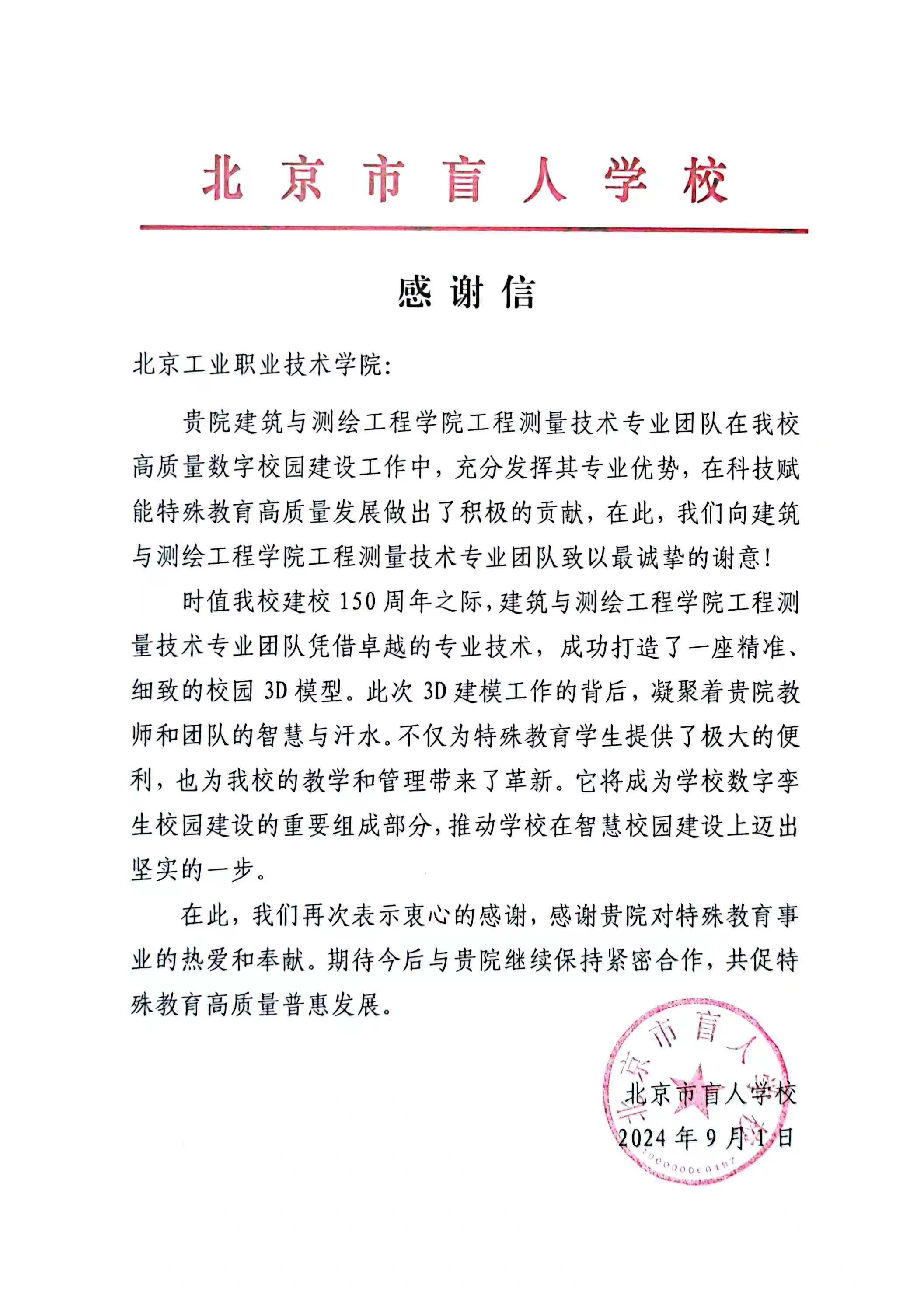 近日,我校收到北京市盲人學(xué)校發(fā)來的感謝信。信中對我院建筑與測繪工程學(xué)院工程測量技術(shù)專業(yè)團(tuán)隊在推進(jìn)其高質(zhì)量數(shù)字校園建設(shè)中所做的工作表示誠摯的感謝。